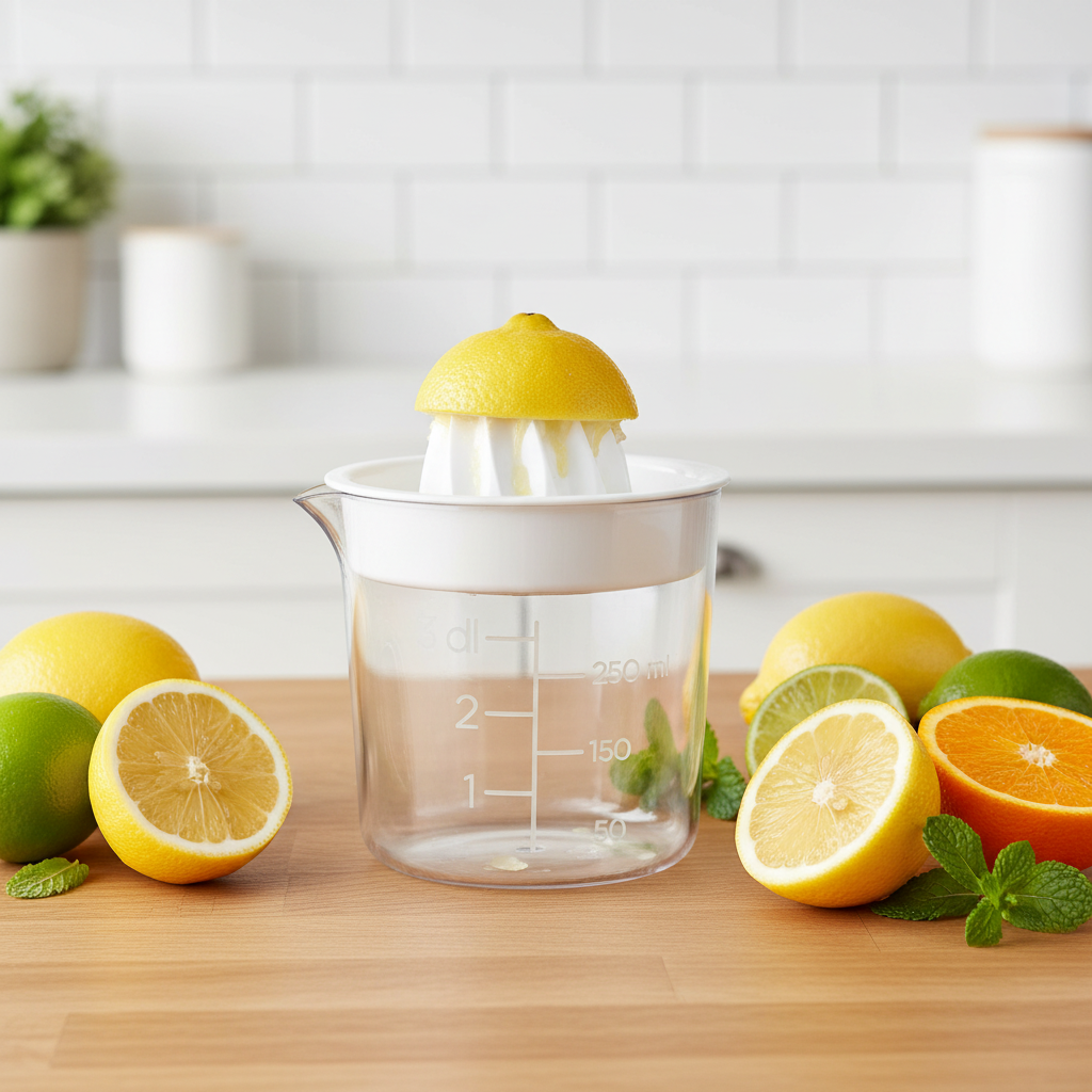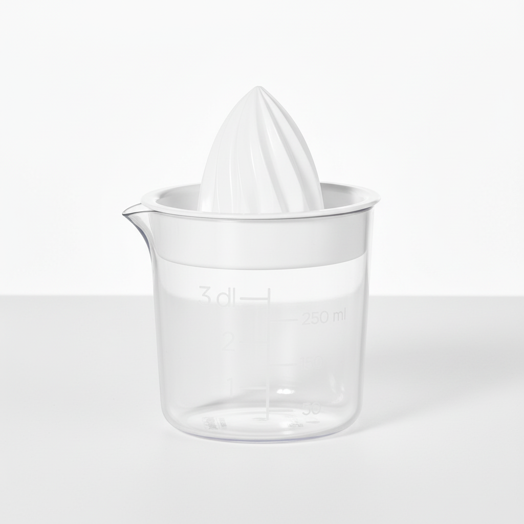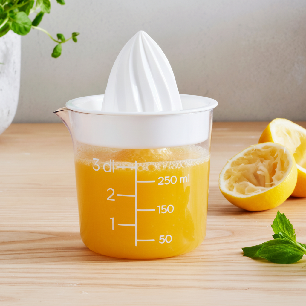 Med integrert målebeger, helletut og tydelig måleskala får du et praktisk kjøkkenredskap som gjør både pressing og oppmåling enklere. Den spiralformede toppen bidrar til mer effektiv pressing, mens beholderen samler opp juicen og gjør det lett å helle videre uten drypp.