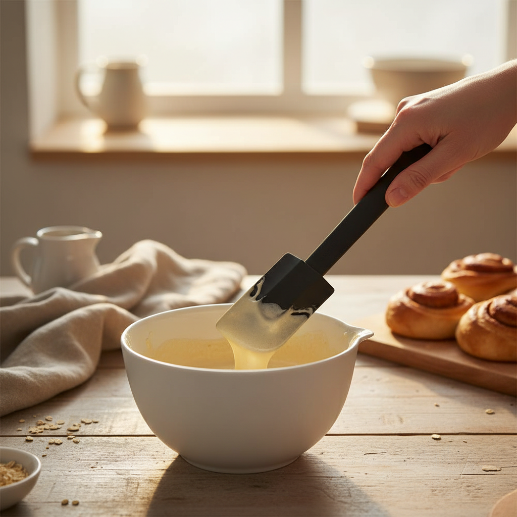 Med buet kant på den ene siden og rett kant på den andre får du et redskap som fungerer godt både i runde bakeboller og på flatere flater. Den smarte formen gjør det enklere å samle opp mer av røren og fordele den jevnt, enten du baker kaker, lager sauser eller jobber med lettere deiger.