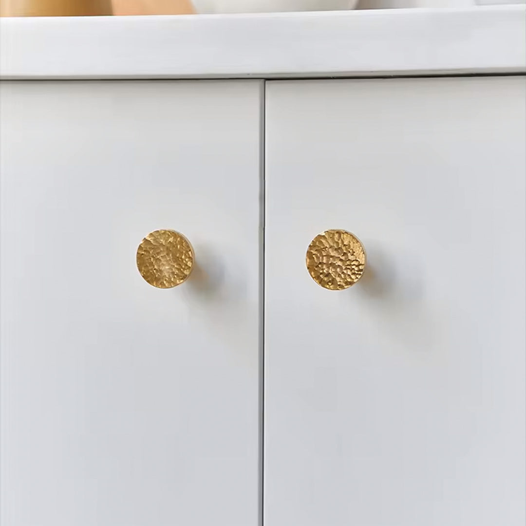 Oslo knott i hamret messing. Denne nydelige knotten har et moderne og tidløst design som tar seg godt ut i nordiske hjem. Gi nytt liv til kommoder, kjøkken, skap eller baderomsinnredning med denne flotte knotten.