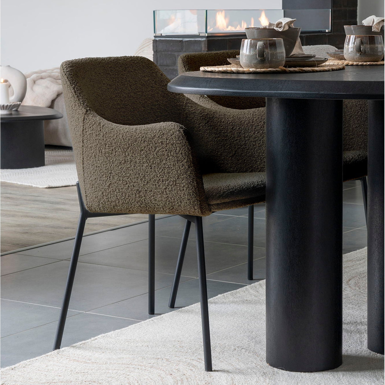 Den myke bouclé-tekstil i brun nyanse gir et varmt og eksklusivt preg, samtidig som de slanke svarte metallbena tilfører et moderne uttrykk. Med polstret sete, avrundet rygg og behagelige armlener får du en stol som er like komfortabel som den er elegant.