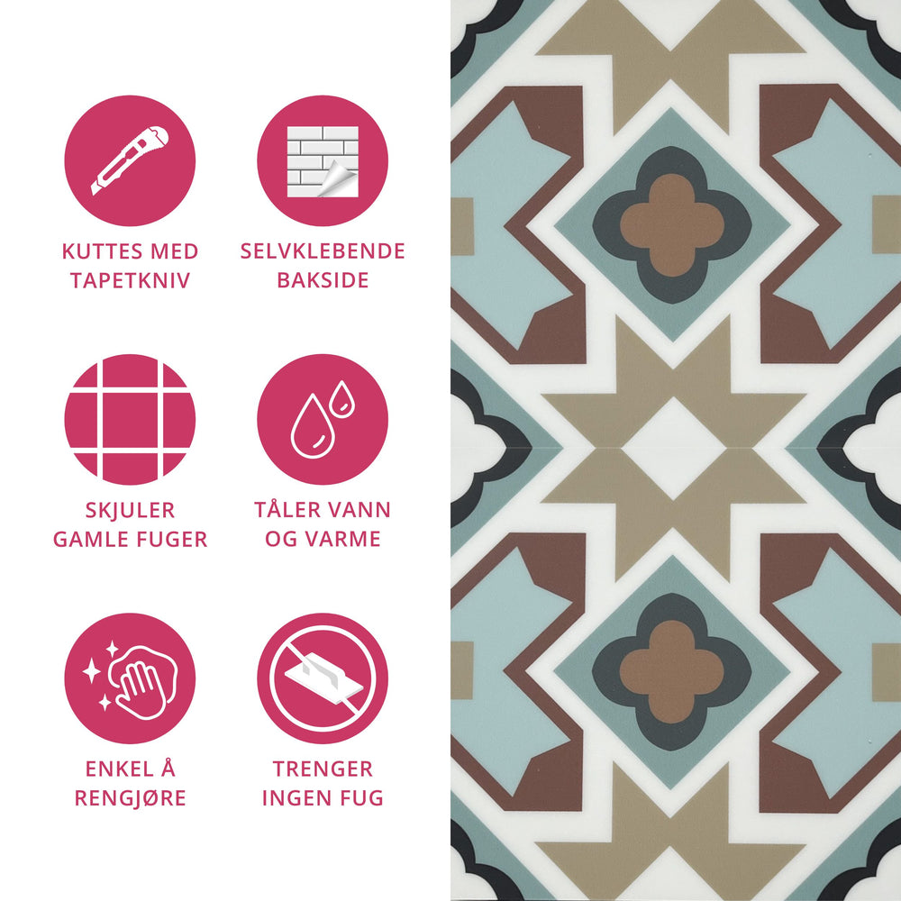 Glad i retro? Da er Lotte selvklebende fliser noe for deg! Lotte fliser har et retro motiv i duse farger. Tøff sammen med treverk.