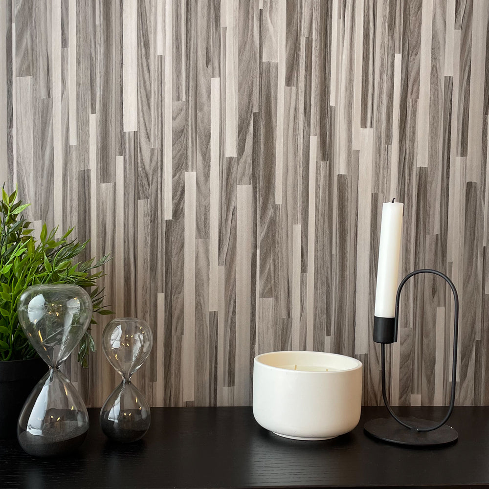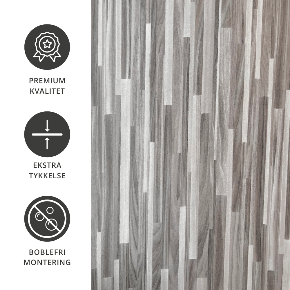 Birmingham grå premium kontaktplast er en moderne grå folie som etterligner parkett i en dempet grå/greige-farge med små staver.
