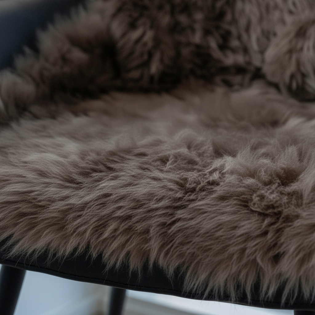 Elegant grå lammeskinn brukt på moderne stol for myk komfort.