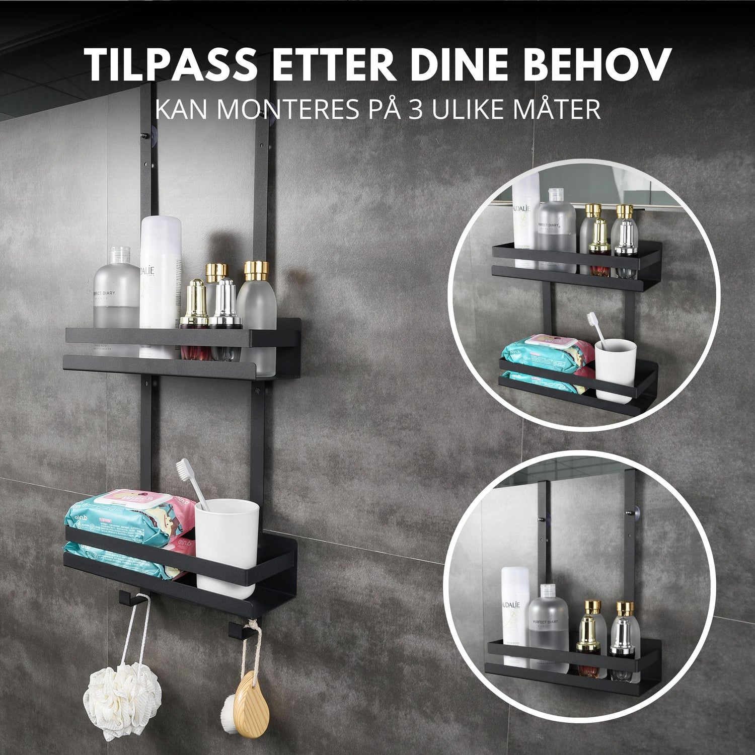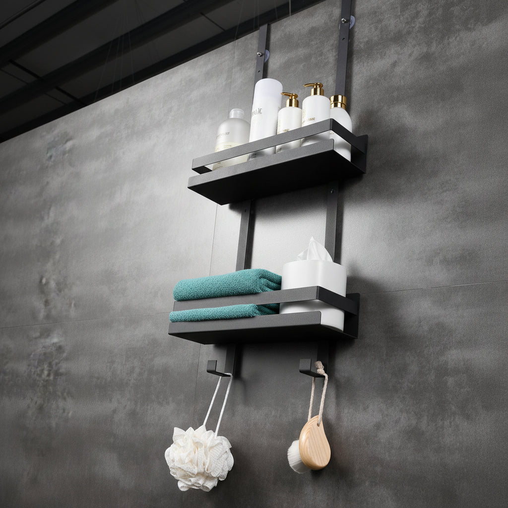 Med to romslige hyller og to kroker på undersiden får du god plass til sjampo, balsam, såpe og annet du bruker hver dag. Den matte sorte finishen gir et rent og moderne uttrykk som passer godt inn på badet, samtidig som den praktiske utformingen gjør det enklere å holde produktene samlet og lett tilgjengelige.