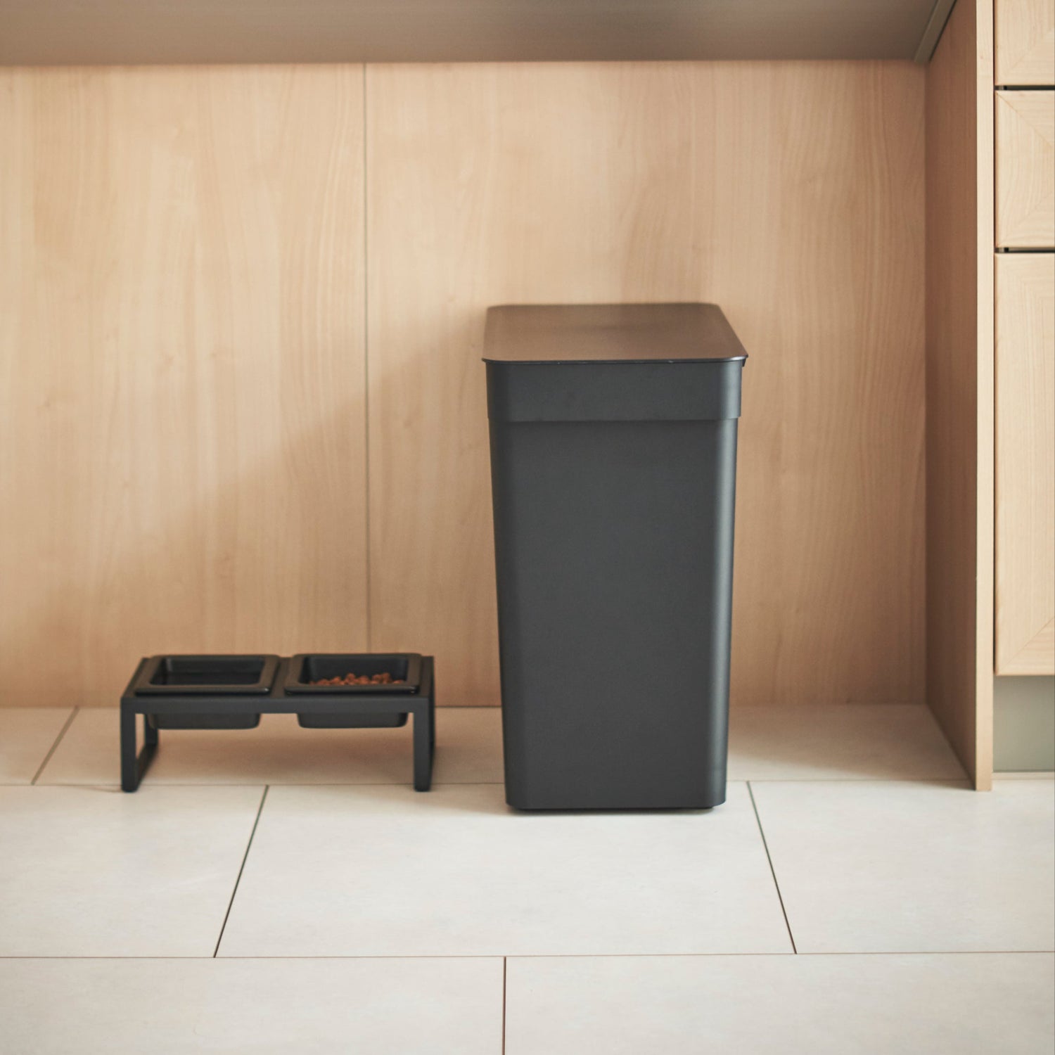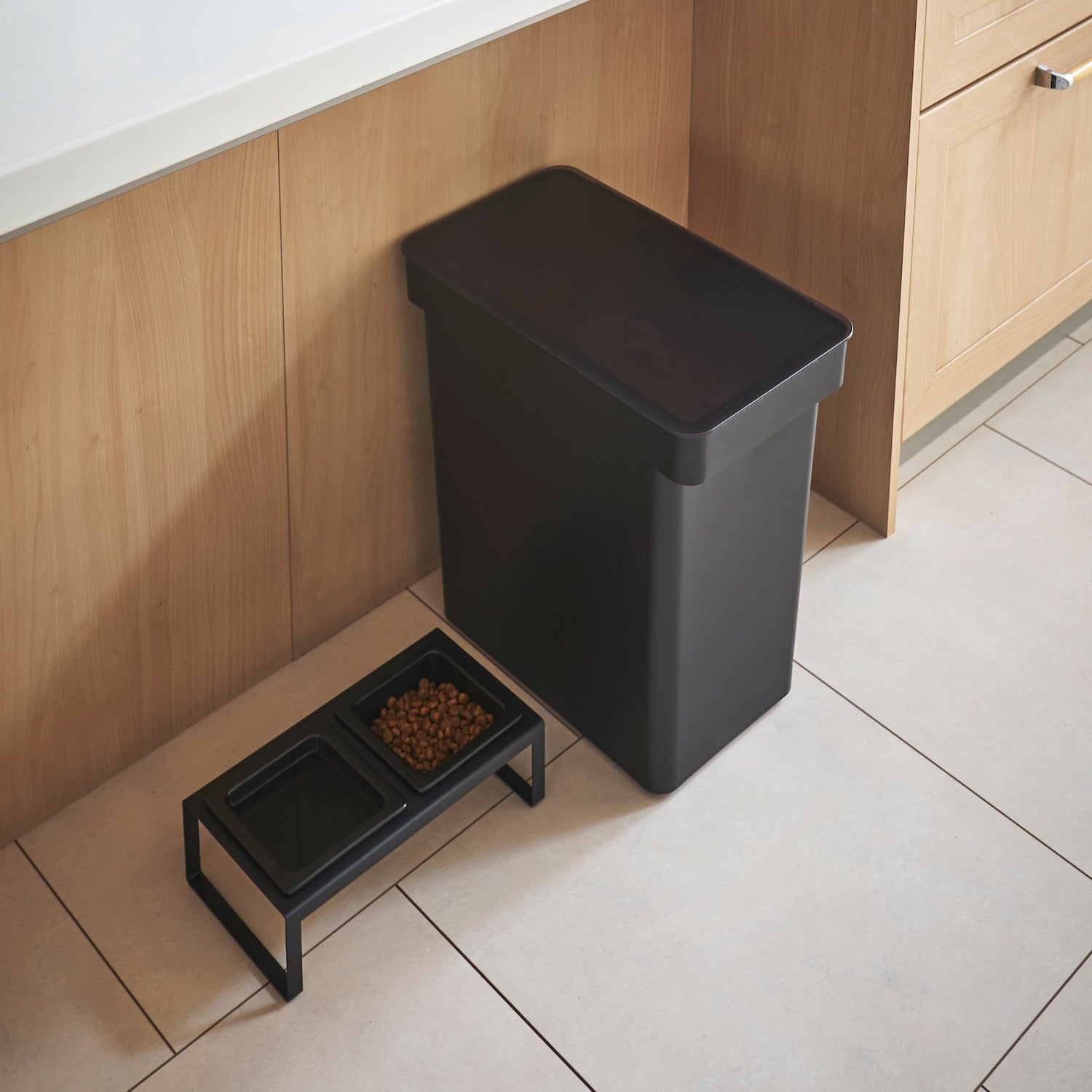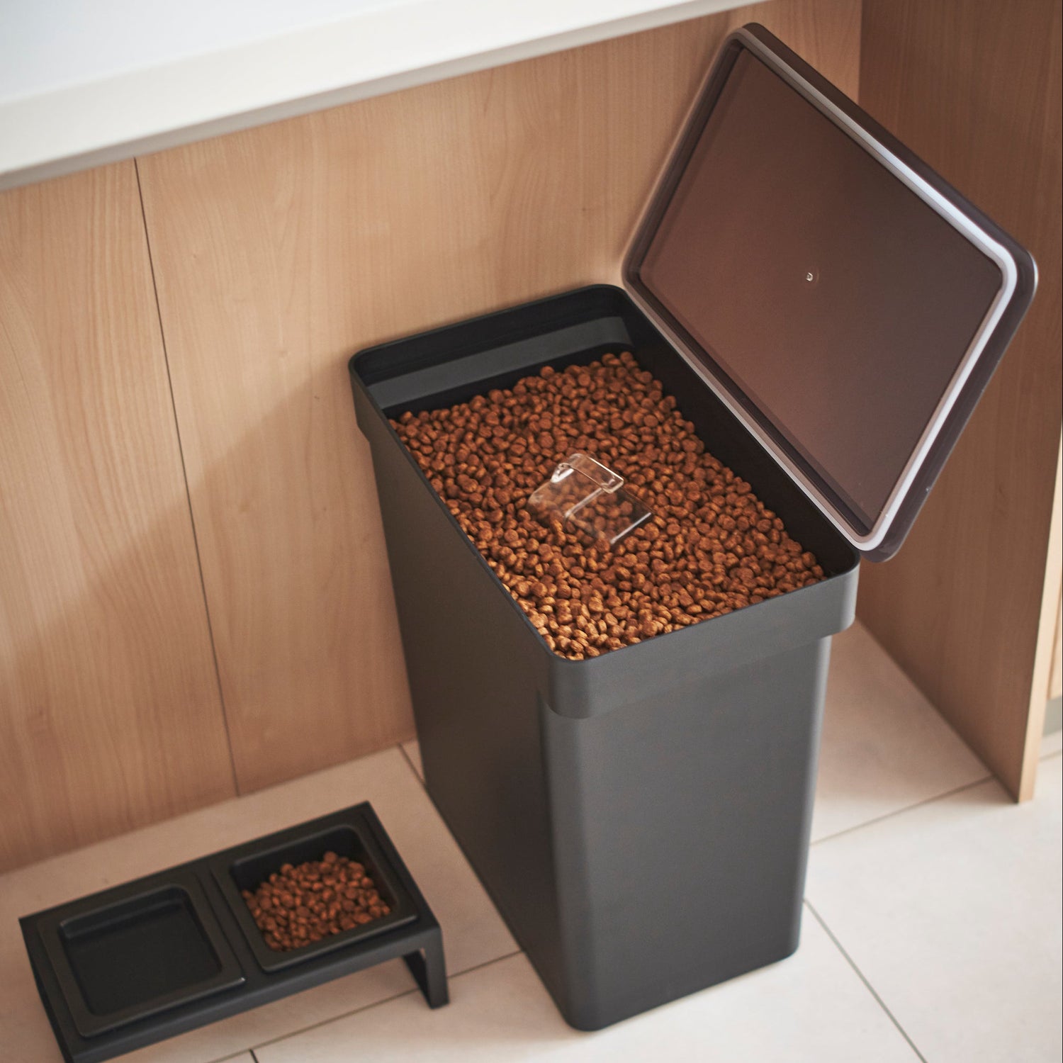 Den stilrene sorte utførelsen passer inn i ethvert hjem, og den medfølgende målekoppen gjør det enkelt å porsjonere riktig mengde fôr.