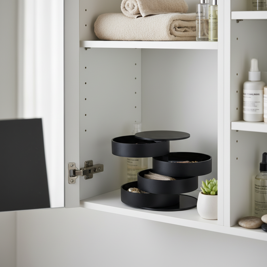 Hold smykkene dine organisert og lett tilgjengelige med disse stilrene roterbare smykkeboksene i sort.