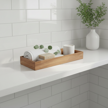 Hold sminke, hudpleie og håndklær ryddig og lett tilgjengelig.