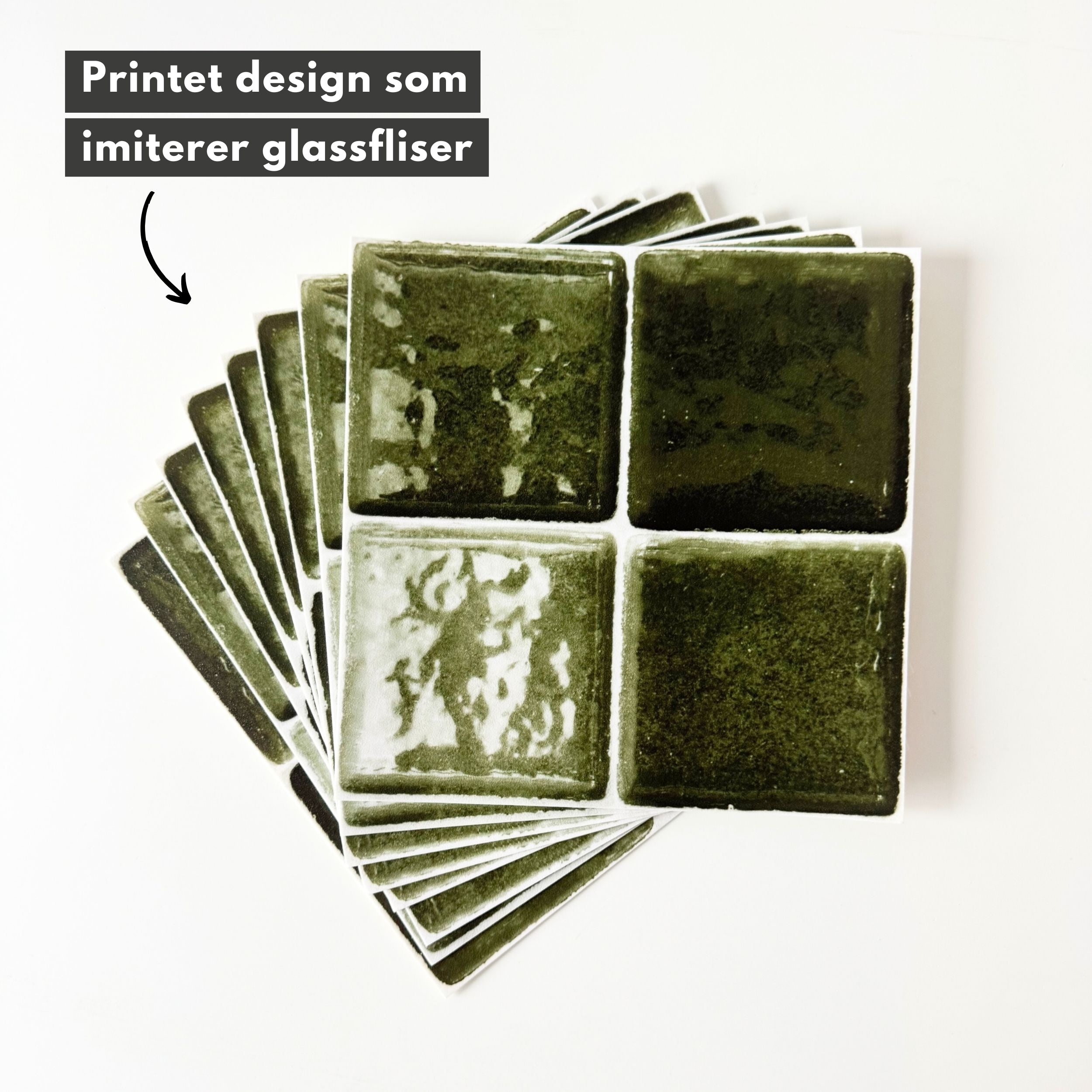 Ezra flaskegrønn selvklebende fliser imiterer kvadratiske glassfliser i en flaskegrønn farge. Passer godt til fornyelse av kjøkkenet.