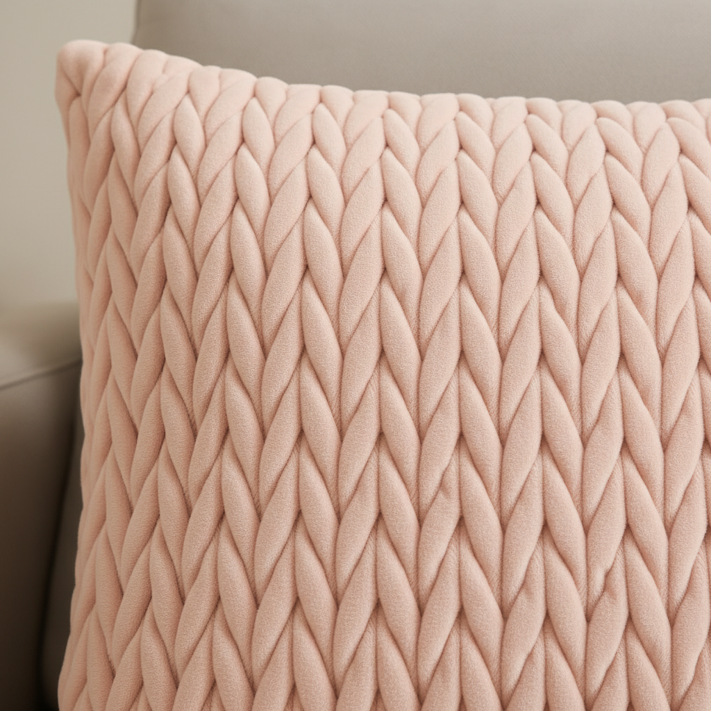 Dekorativt lyserosa putetrekk med flettet velurtekstur plassert på en lys sofa.