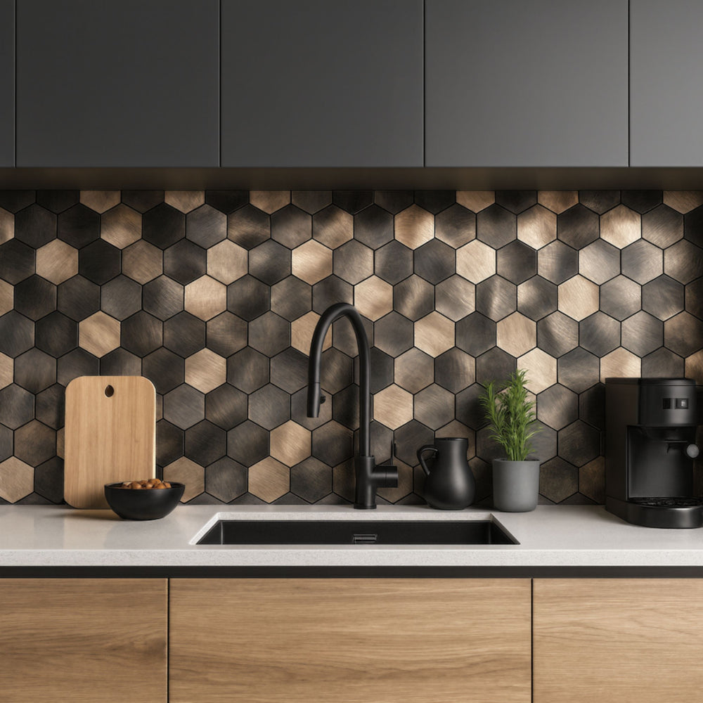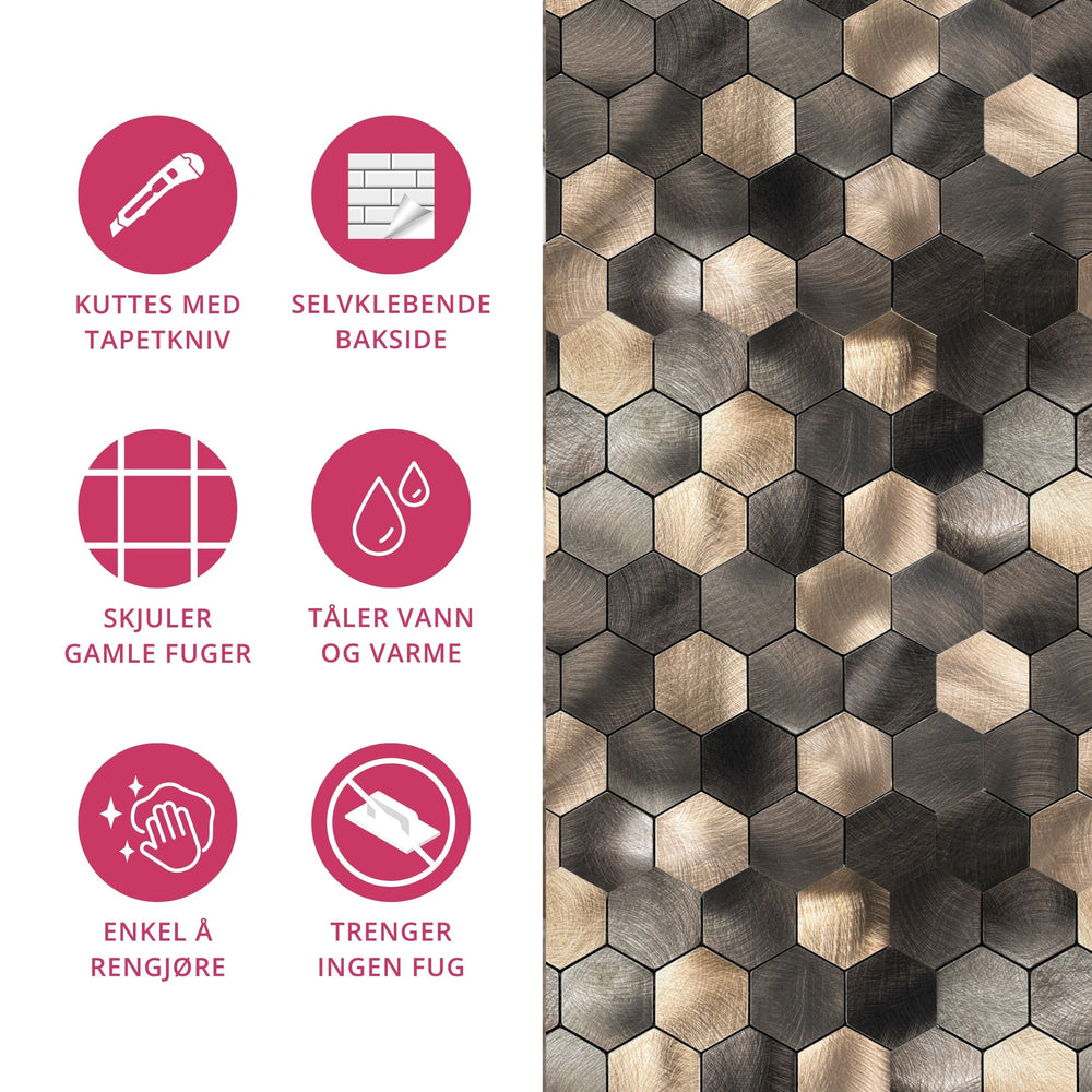 Gi kjøkkenet, badet eller vaskerommet et moderne uttrykk med våre Latte hexagon selvklebende veggfliser. De unike sekskantede flisene kombinerer varme latte-nyanser i en elegant mix av lyse og mørke toner, og skaper et levende og rent uttrykk på veggen.
