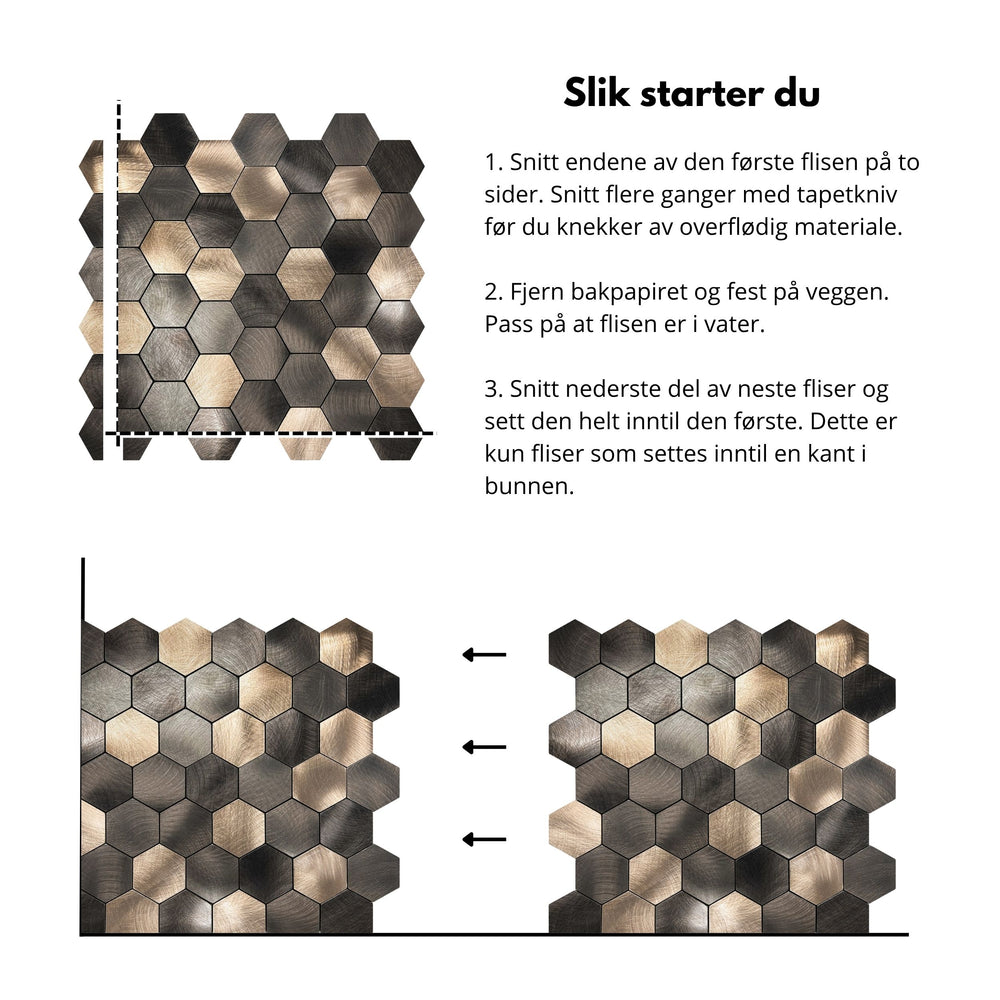 Flisene har selvklebende bakside som gjør monteringen enkel, uten behov for lim, fug eller spesialverktøy. Festes direkte på en ren og jevn flate, og kan kuttes med en vanlig tapetkniv for perfekt tilpasning.