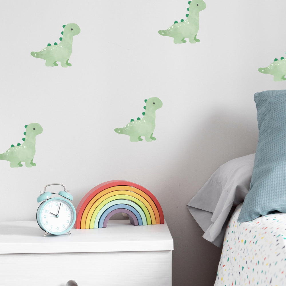 Pakke med 25 stk søte, identiske dinosaurer i grønn farge. Wallstickeren designet og printet for å se ut som vannmaling på lerret.