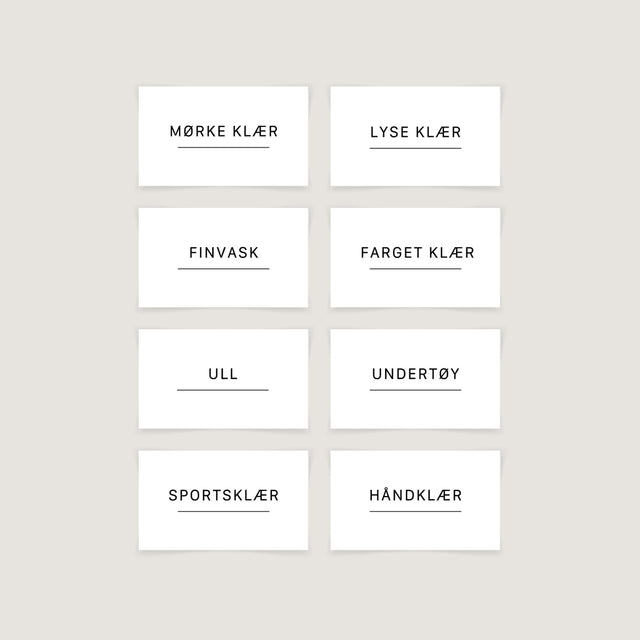 Denne pakken inneholder etiketter til: Mørke klær, Lyse klær, Farget klær, Finvask, Undertøy, Håndklær, Ullklær, Sportsklær