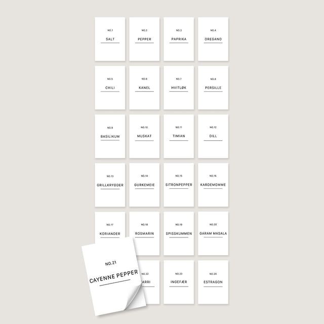 Denne pakken inneholder etiketter til: Salt, Pepper, Paprika, Oregano, Chili, Kanel, Hvitløk, Persille, Basilikum, Muskat, Timian, Dill, Grillgrydder, Gurkemeie, Sitronpepper, Kardemomme, Koriander, Rosmarin, Spisskummen, Garam Masala, Cayennepepper, Karri, Ingefær, Estragon