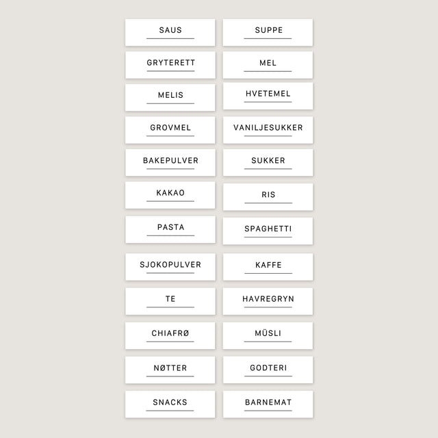 Denne pakken inneholder etiketter til: Saus, suppe, Gryterett, Mel, Melis, Hvetemel, Grovmel, Vaniljesukker, Bakepulver, Sukker, Kakao, Ris, Pasta, Spaghetti, Sjokopulver/oboy, Kaffe, Te, Havregryn, Chiafrø, Müsli, Nøtter, Godteri, Snacks, Barnemat