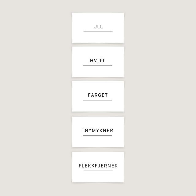 Denne pakken inneholder etiketter til: Ull, Hvitt, Farget, Tøymykner, Flekkfjerner