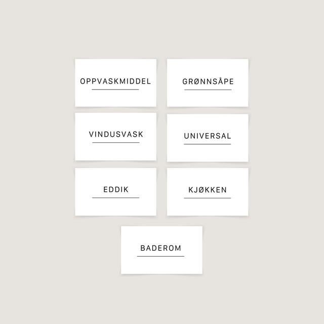 Denne pakken inneholder etiketter til: Eddik, Oppvaskmiddel, Vindusvask, Kjøkken, Baderom, Universal, Grønnsåpe