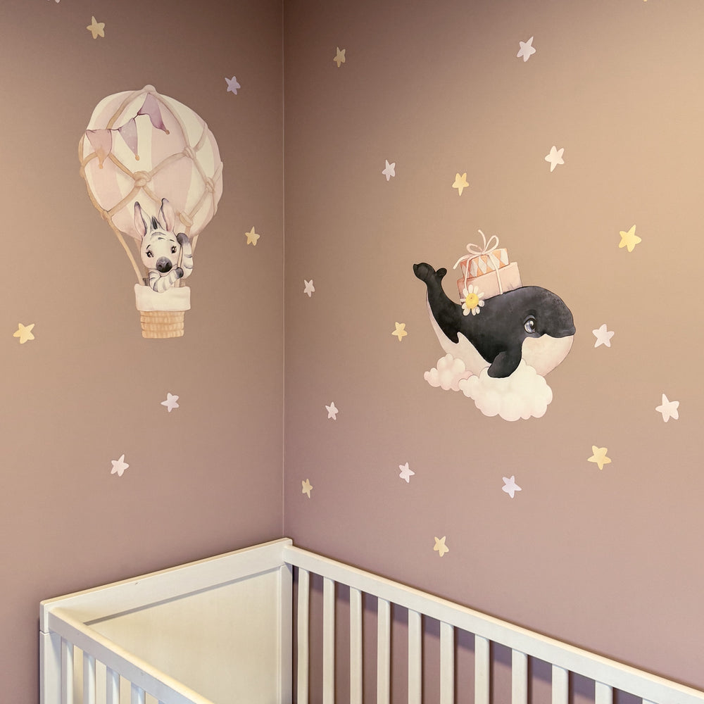 Gjør barnerommet til en drømmeverden med vår fortryllende wallsticker av en søt hval som svever på en sky. Denne unike veggdekoren er laget med en teknikk som etterligner vannmaling på lerret, og gir en følelse av kunstnerisk eleganse og eventyrlig sjarm til barnerommet.