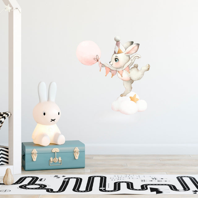 Gjør barnerommet til en drømmeverden med vår fortryllende wallsticker av en søt kanin som svever på en sky, mens den holder til en ballong og vimpler.