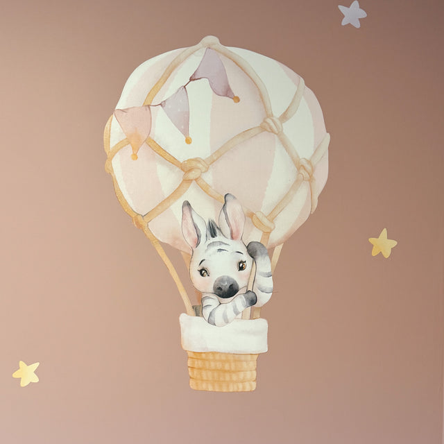 Denne flotte veggdekorasjonen er laget med en teknikk som etterligner vannmaling på lerret, og gir sjarm til barnerom eller lekerom. Motivet er av en søt zebra som holder fast i en luftballong. Klistremerket kommer i duse, rolige farger i rosa, lilla og beige.