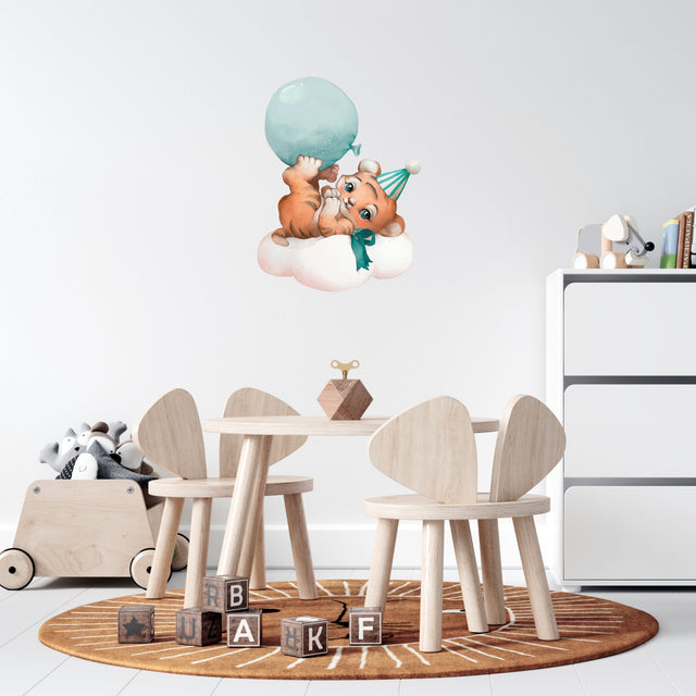 Denne flotte veggdekorasjonen er laget med en teknikk som etterligner vannmaling på lerret, og gir sjarm til barnerom eller lekerom. Motivet er av en lekende tiger som ligger på en sky med en ballong på beina.