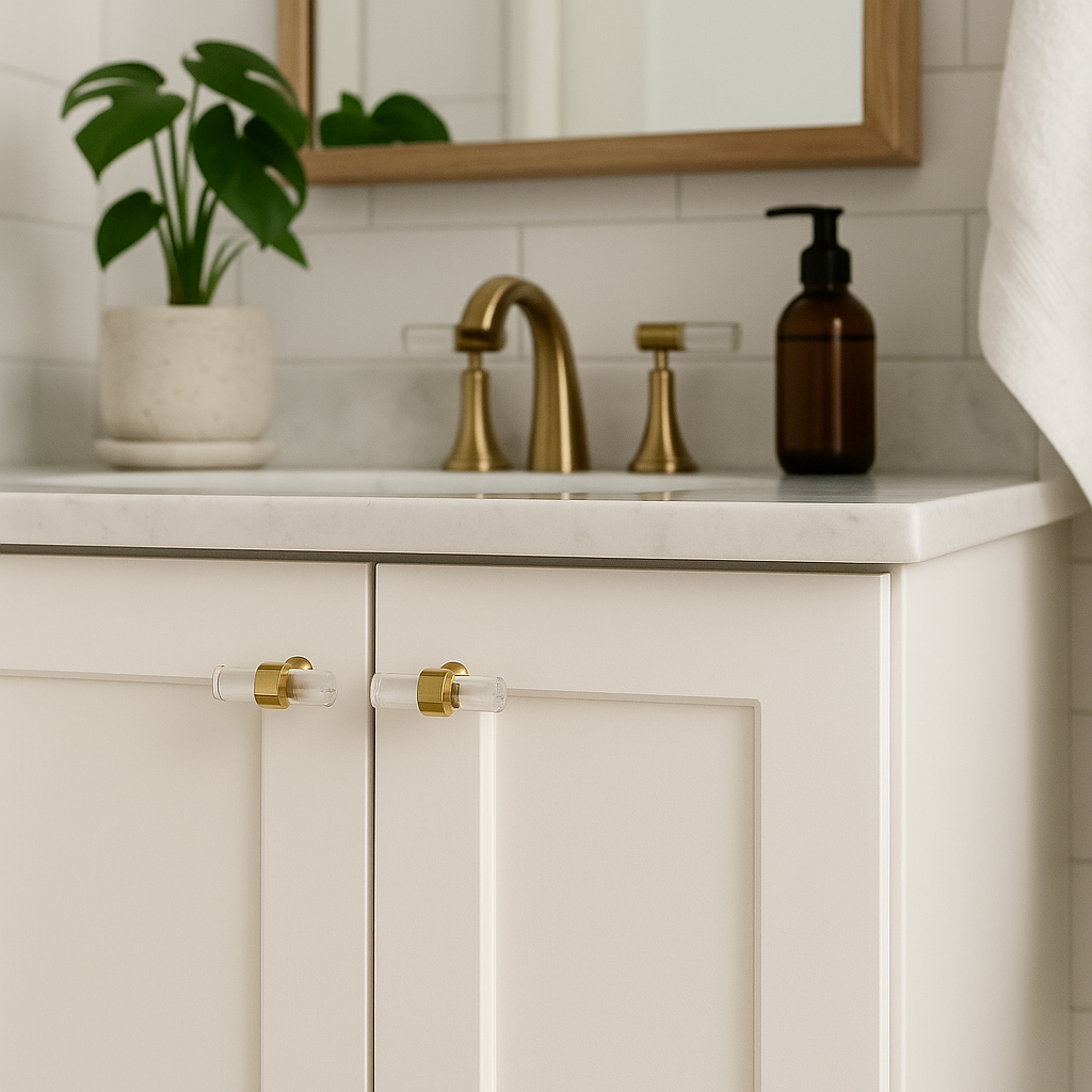 Monterte Nesu T-bar knotter i glass og messing på hvite baderomsskap.