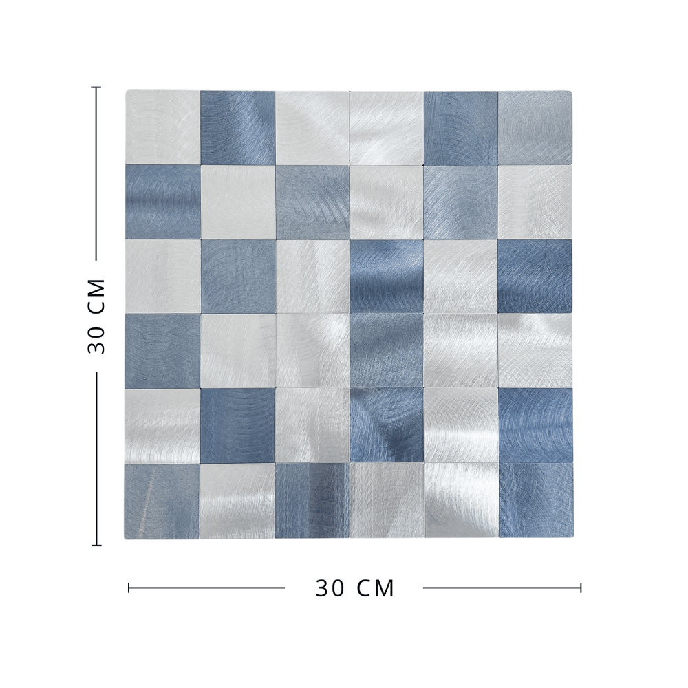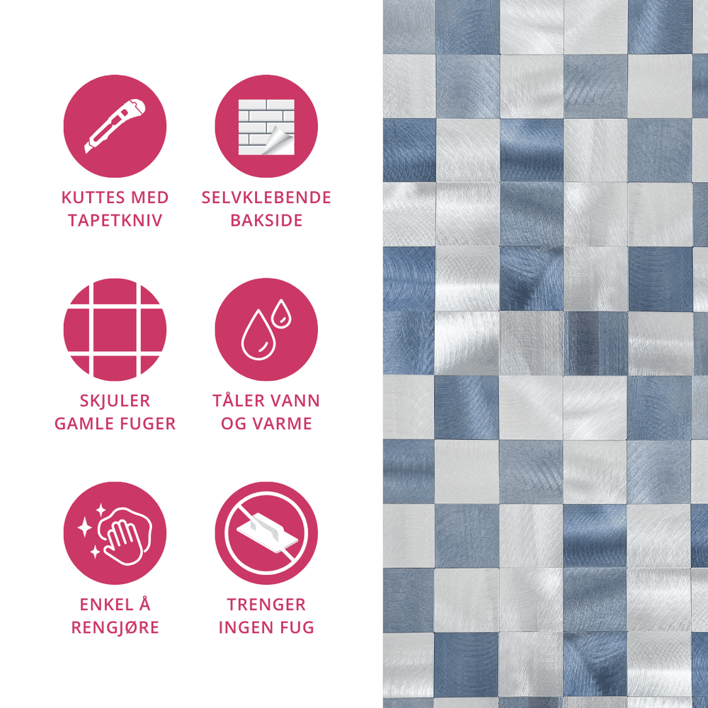 Lykke kvadratisk selvklebende veggfliser gir et moderne og rent uttrykk med sitt design i børstet aluminium. De firkantede flisene kombinerer nyanser av sølv og blått for et friskt og dekorativt utseende som passer godt til både kjøkken og vaskerom.