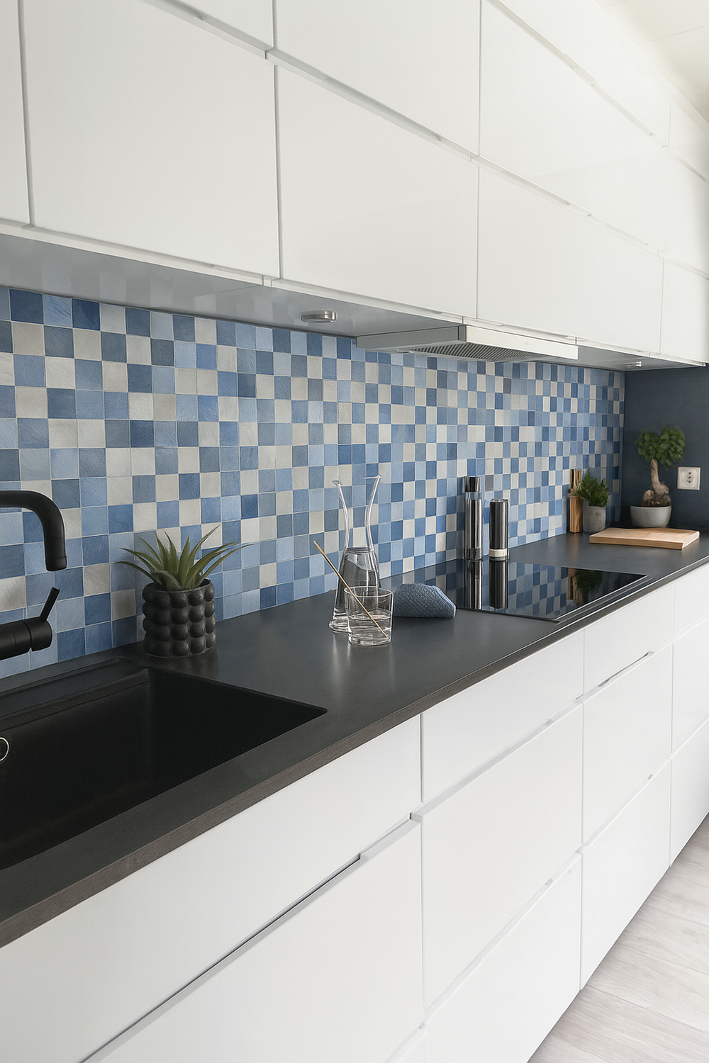 Lykke kvadratiske selvklebende fliser i blått og sølv montert på kjøkkenvegg