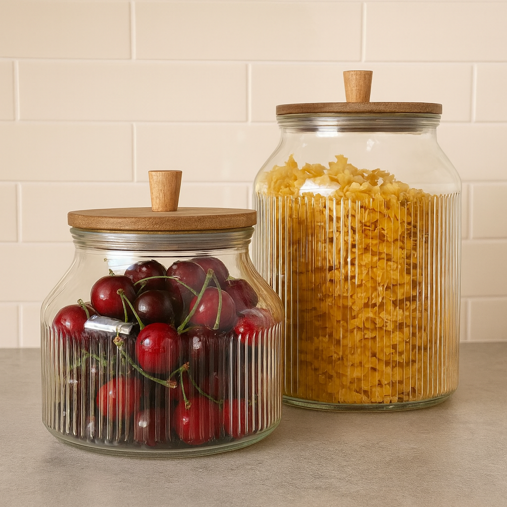 Stilige krukker med rillet glass og lokk i tre. Perfekte til å oppbevare havregryn, pasta eller kaffe. Settet består av: