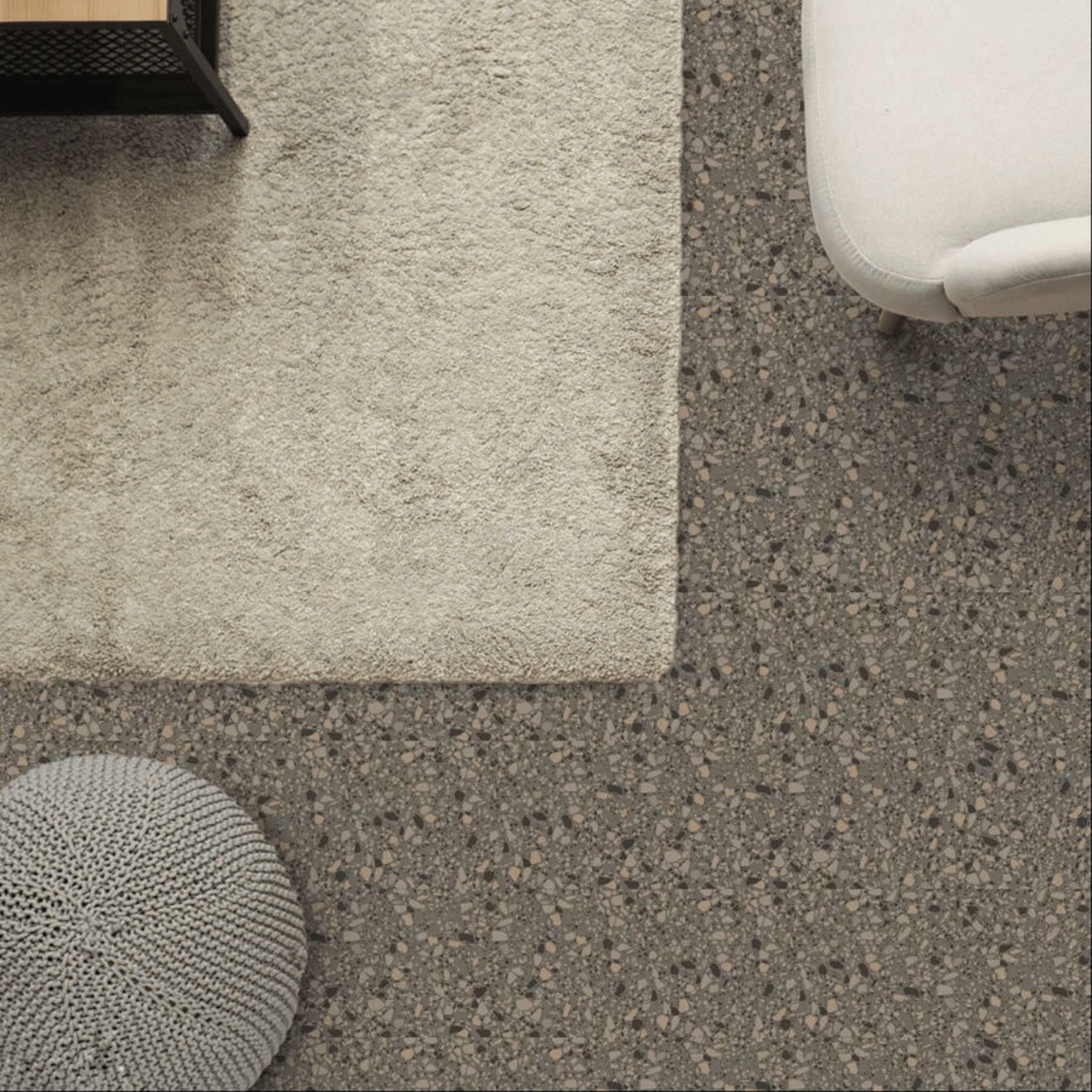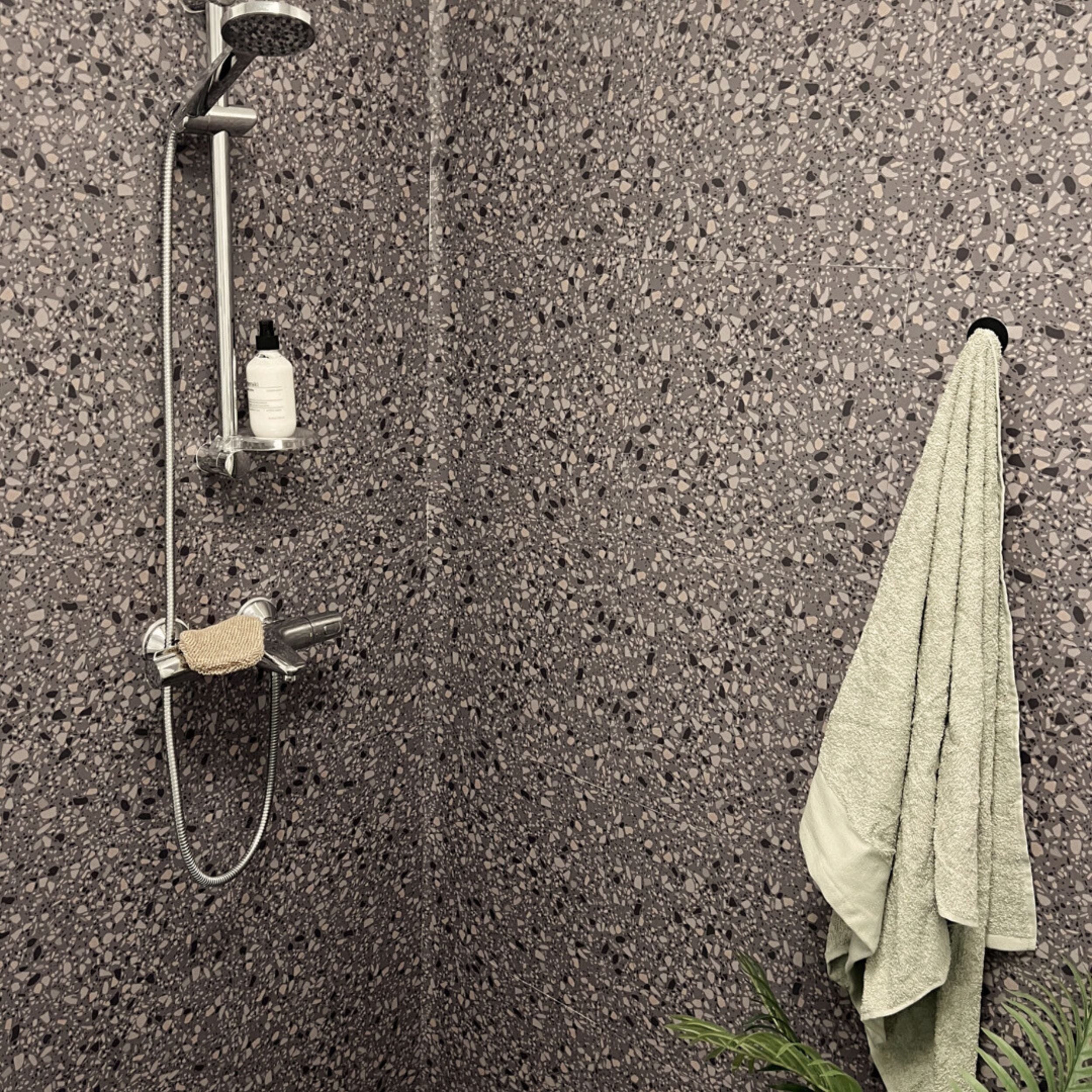 Clemont terrazzo selvklebende fliser gir et varmt og moderne uttrykk med sitt naturtro terrazzo-mønster i nøytrale bruntoner. Flisene kombinerer små fargetoner i beige, brun og krem som skaper en harmonisk og elegant overflate.
