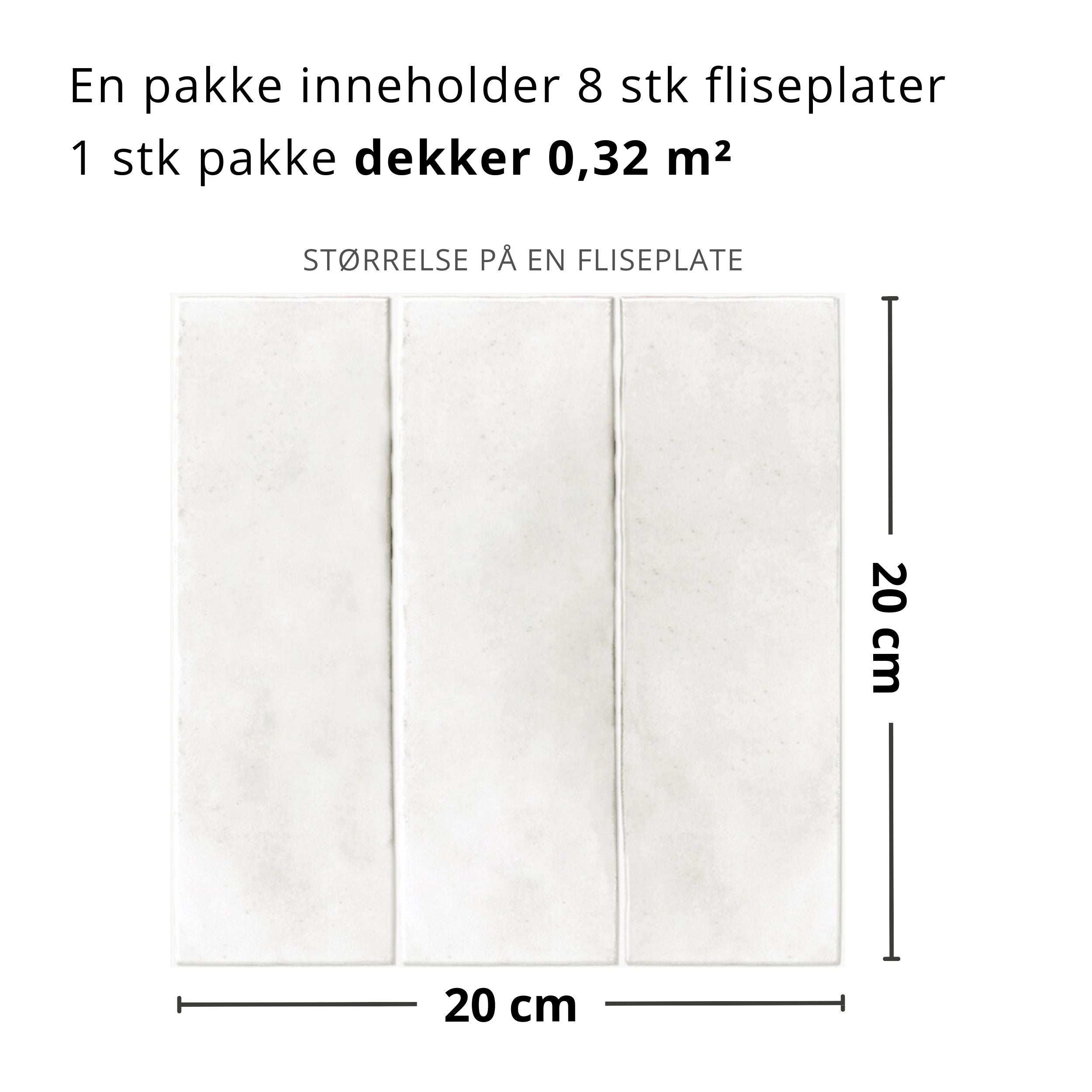 Flisene kan monteres både horisontalt og vertikalt, eller kombineres for et unikt mønster. De festes enkelt uten behov for fugemasse, og egner seg perfekt til kjøkken, bad eller vaskerom.
