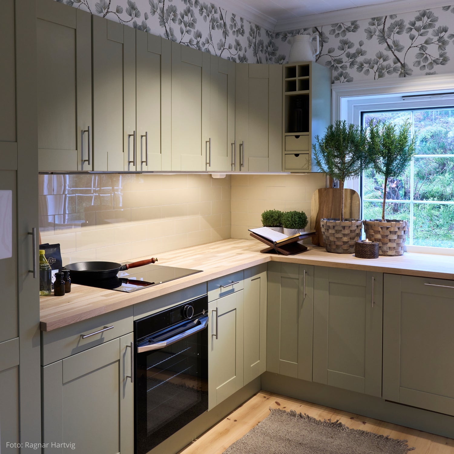 Flisene gir et varmt, nordisk preg som passer perfekt til de grønne frontene og de lyse tretonene på benkeplaten.