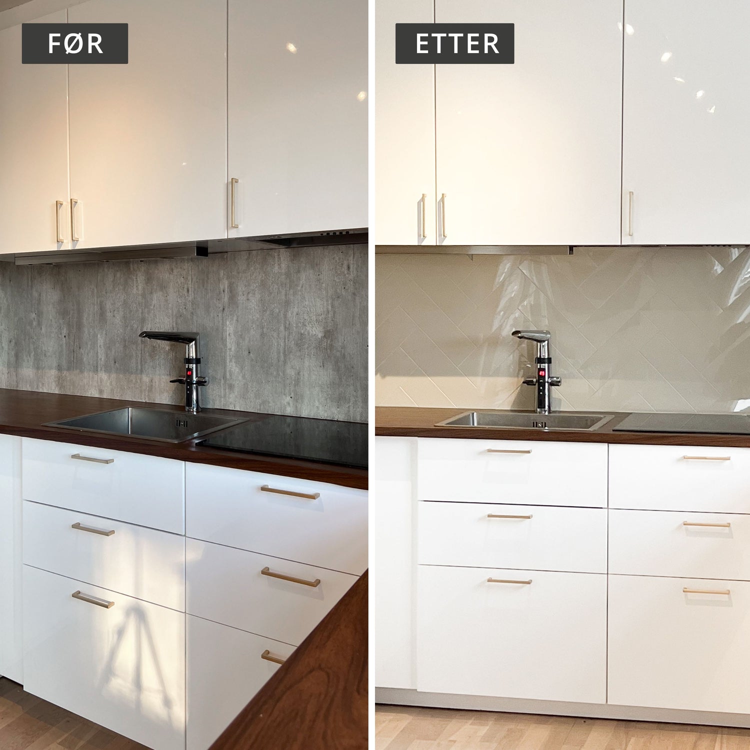 Se hvordan Halvor Bakke og teamet forvandlet et mørkt og tungt kjøkken til et lyst, moderne rom med våre Hailey beige selvklebende fliser