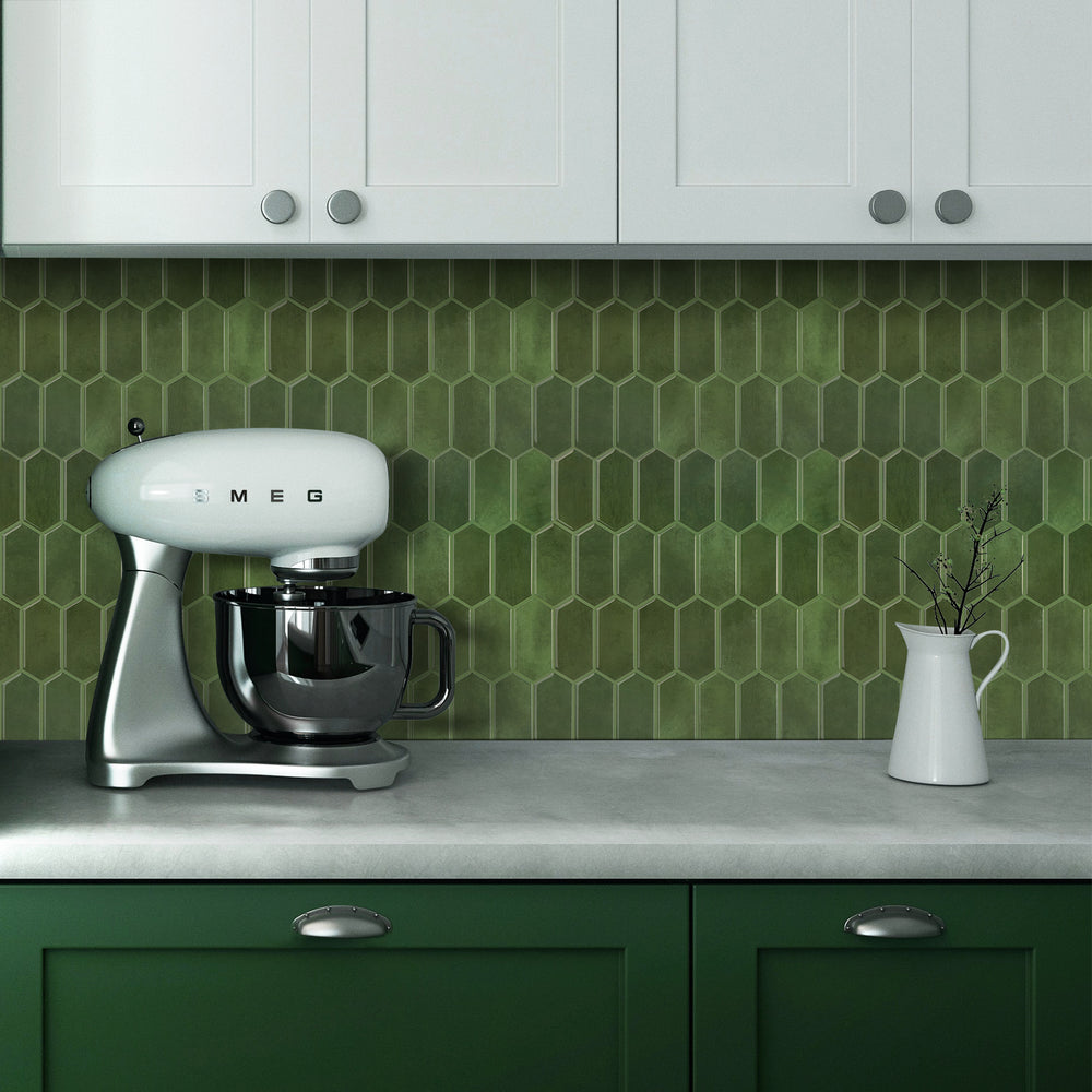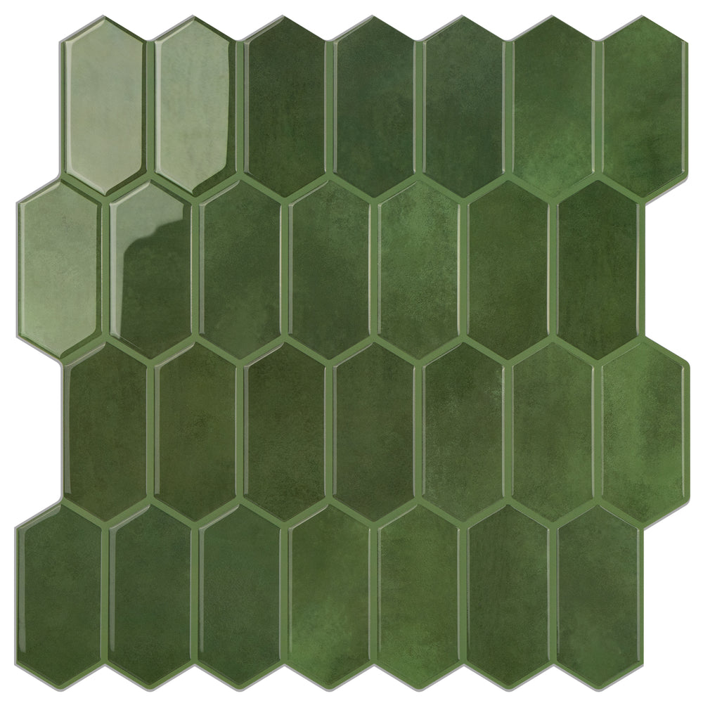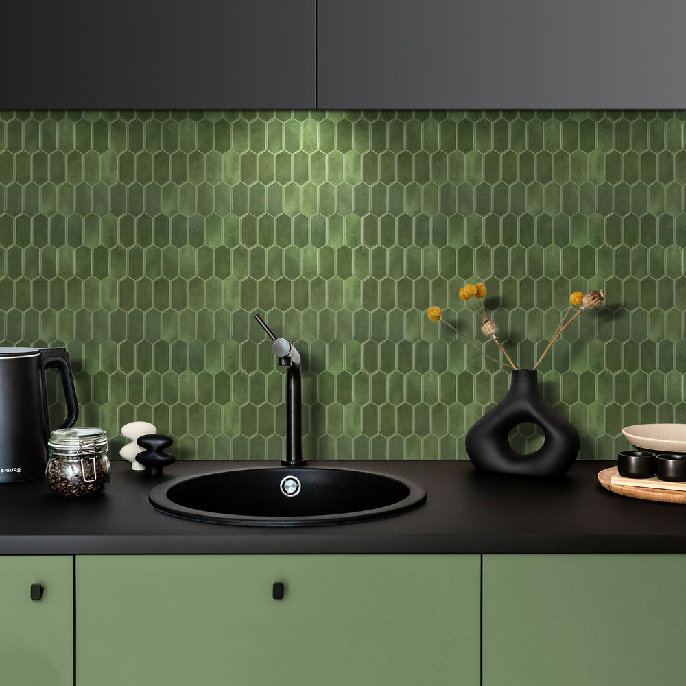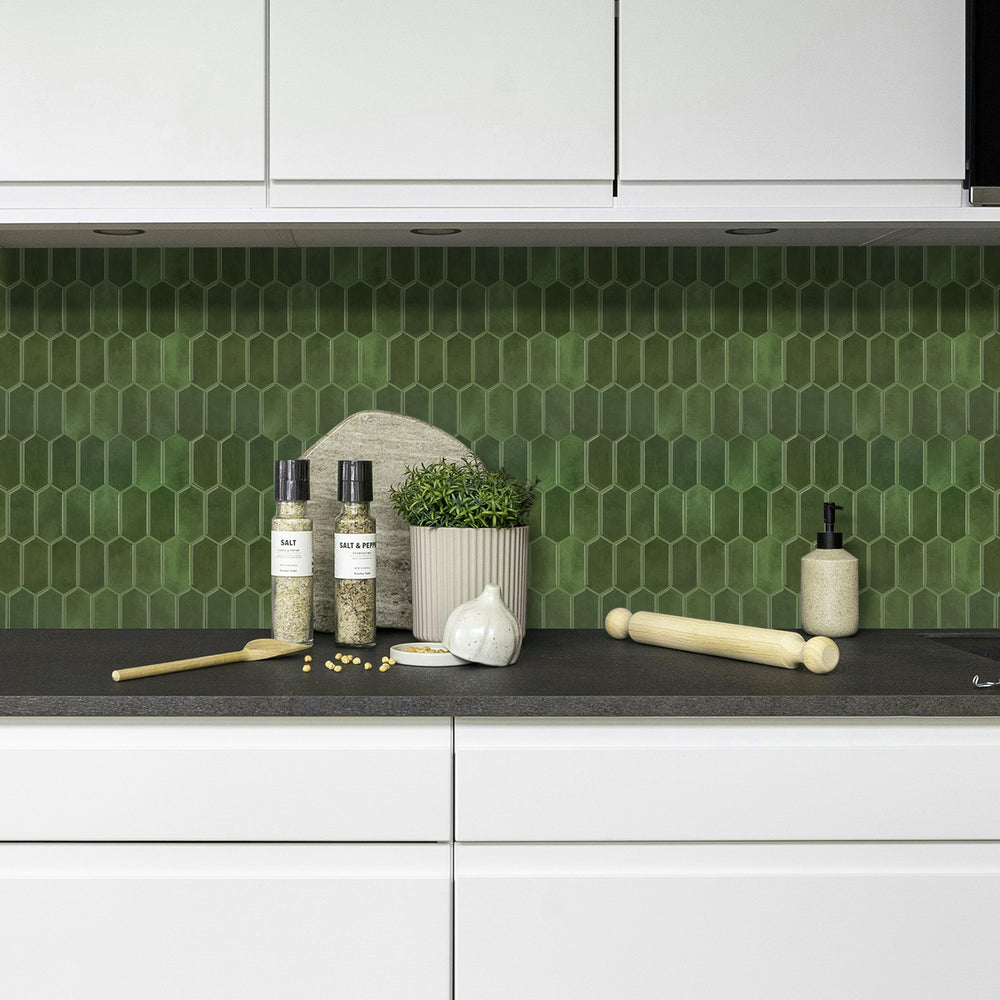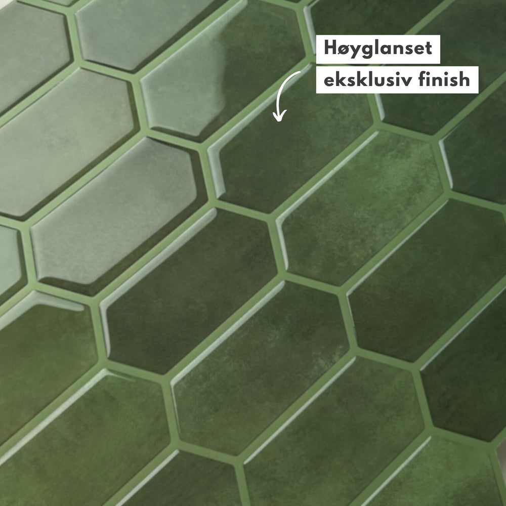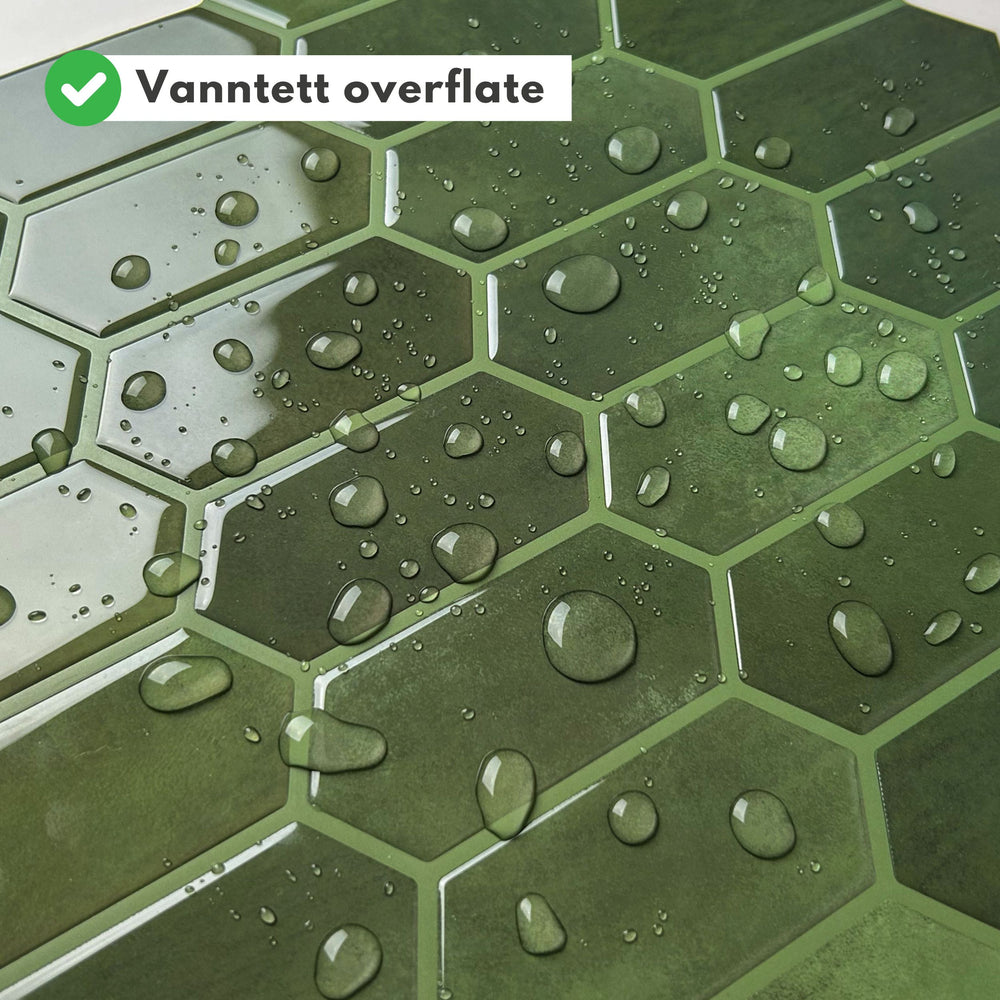 Alexandra Grønn selvklebende fliser gir et levende uttrykk med sin dype, grønne farge og unike sekskantede form.