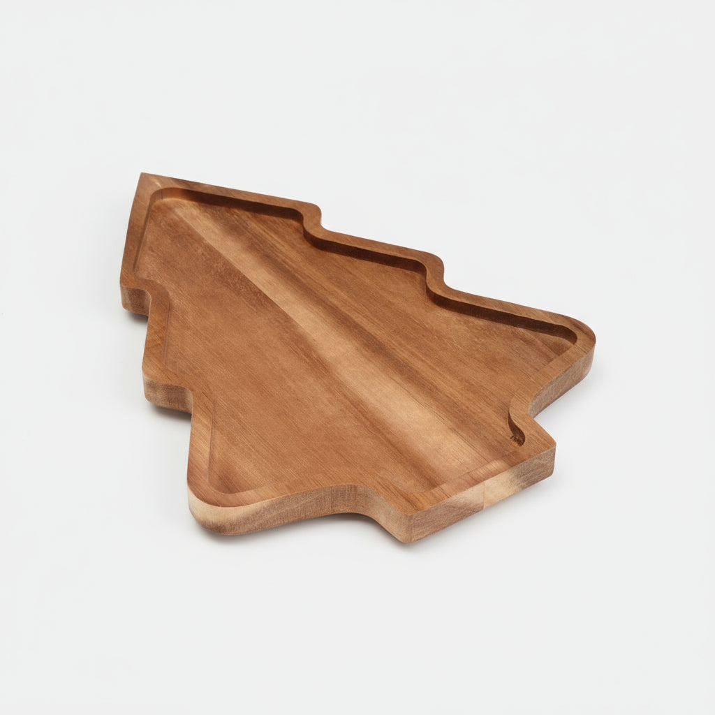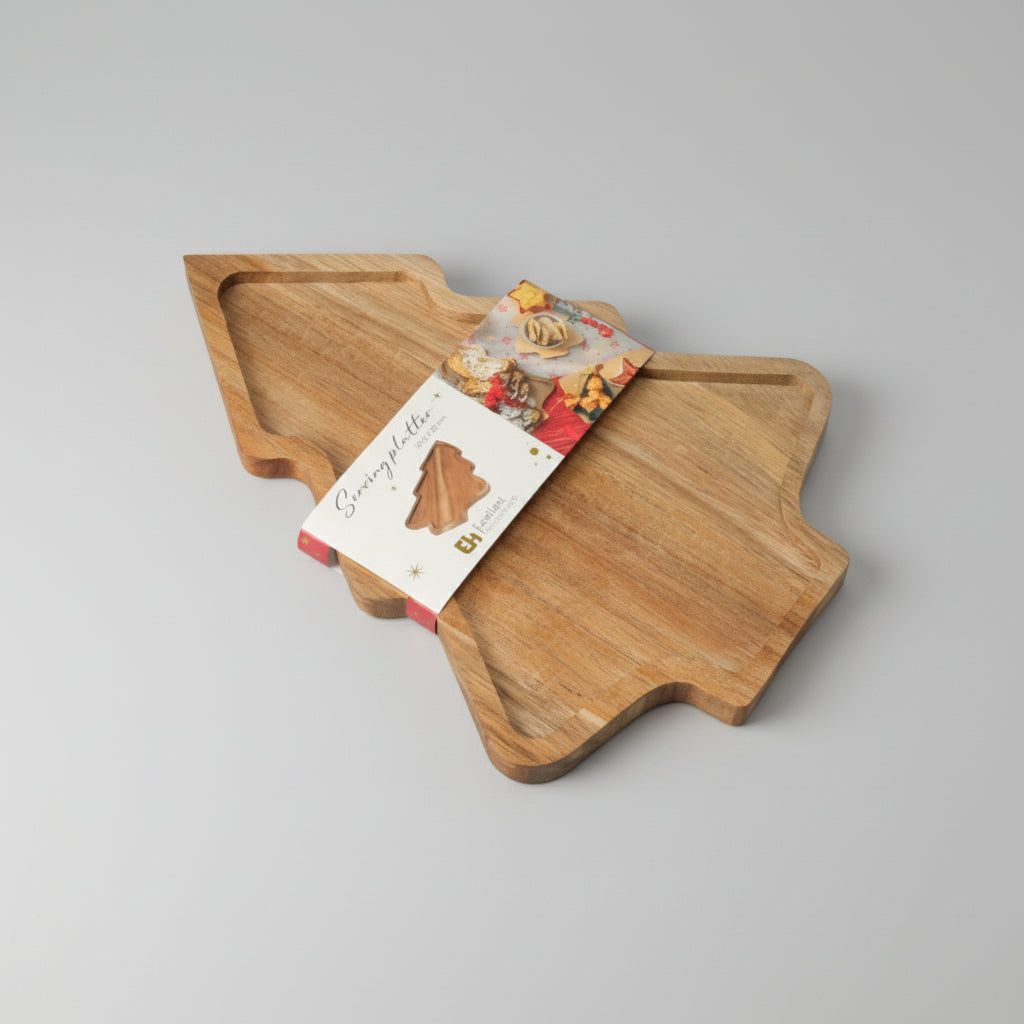 Et vakkert serveringsfat formet som et juletre. Fatet er laget i naturlig treverk og gir bordet en varm og innbydende følelse.