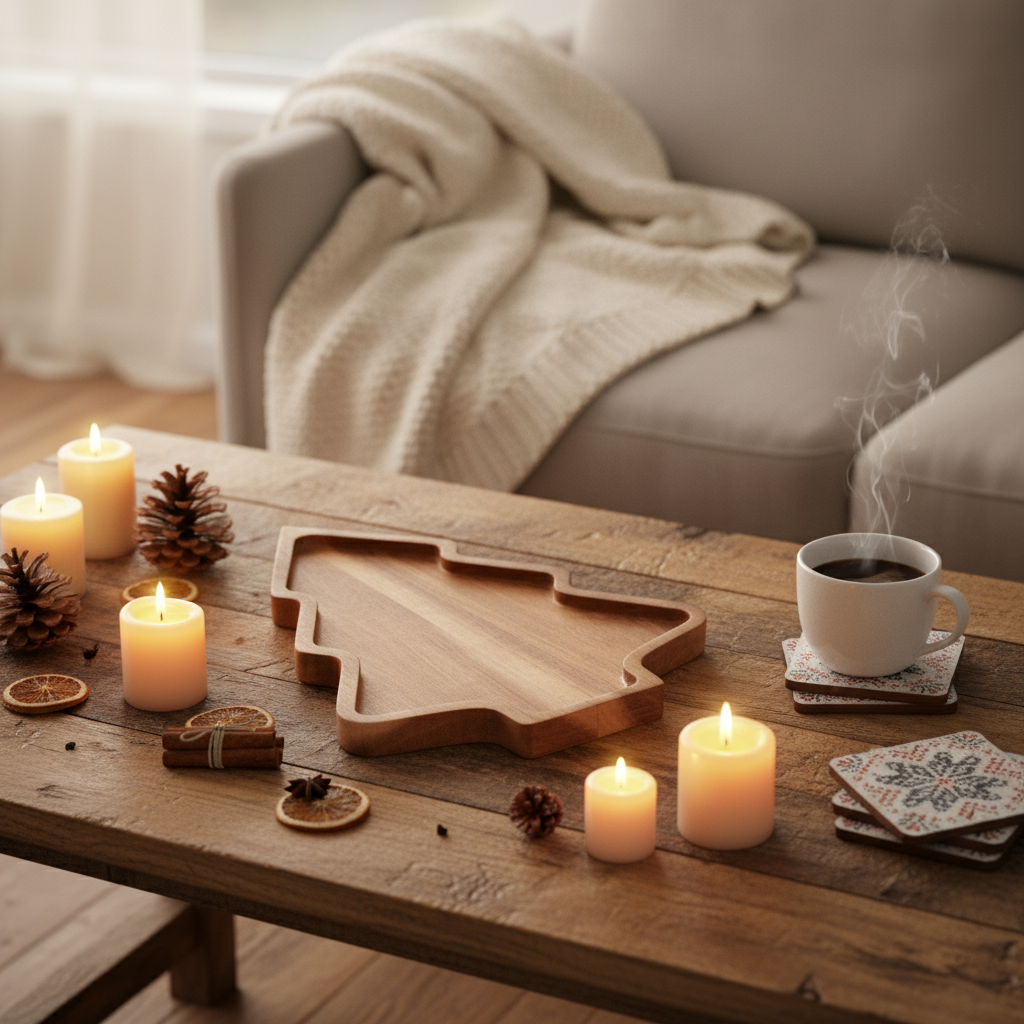 Serveringsfat formet som juletre i treverk med julepynt rundt