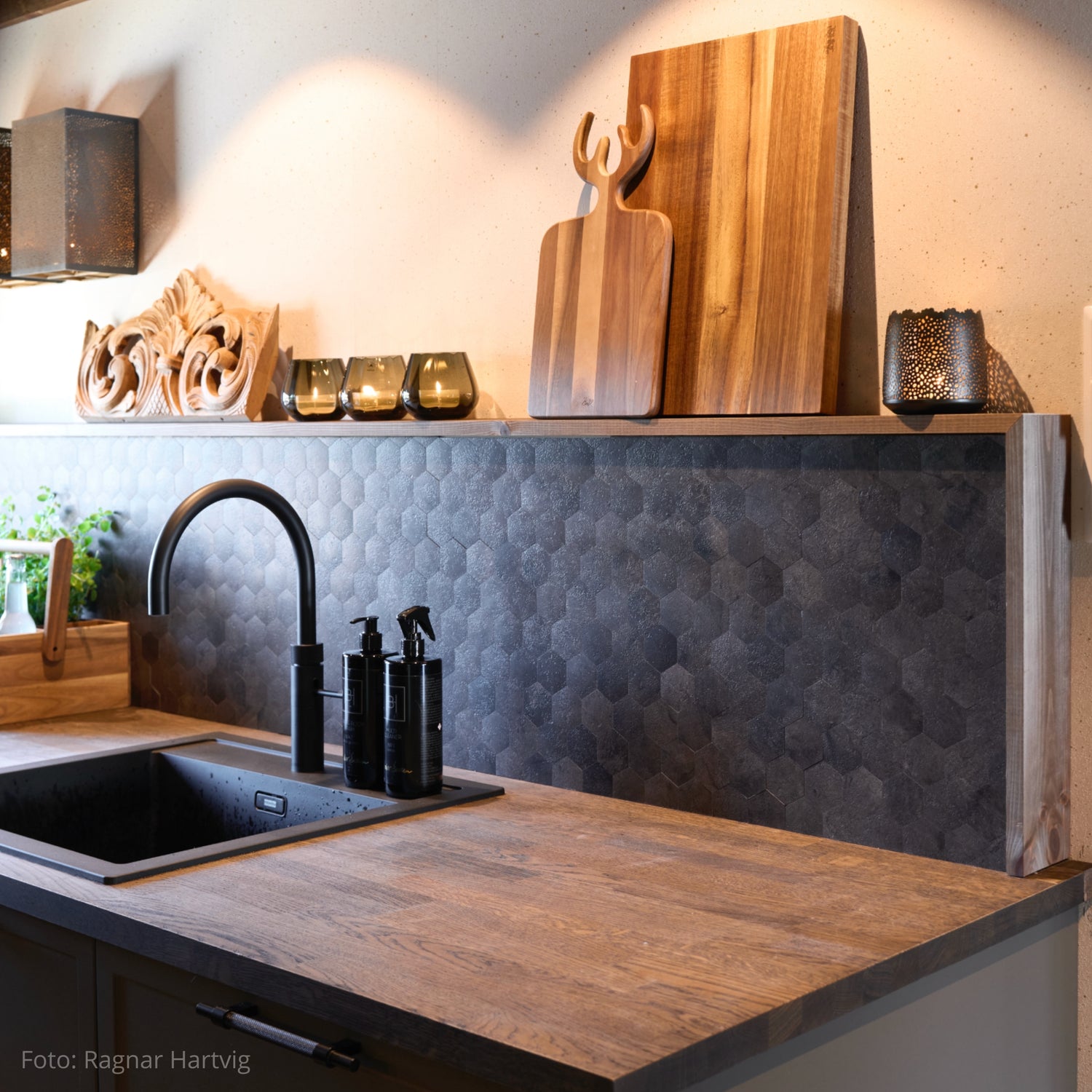 Hexagon mørkegrå betong passer spesielt godt bak kjøkkenbenk, på baderomsvegger eller i vaskerom der du ønsker en slitesterkt og moderne vegg.