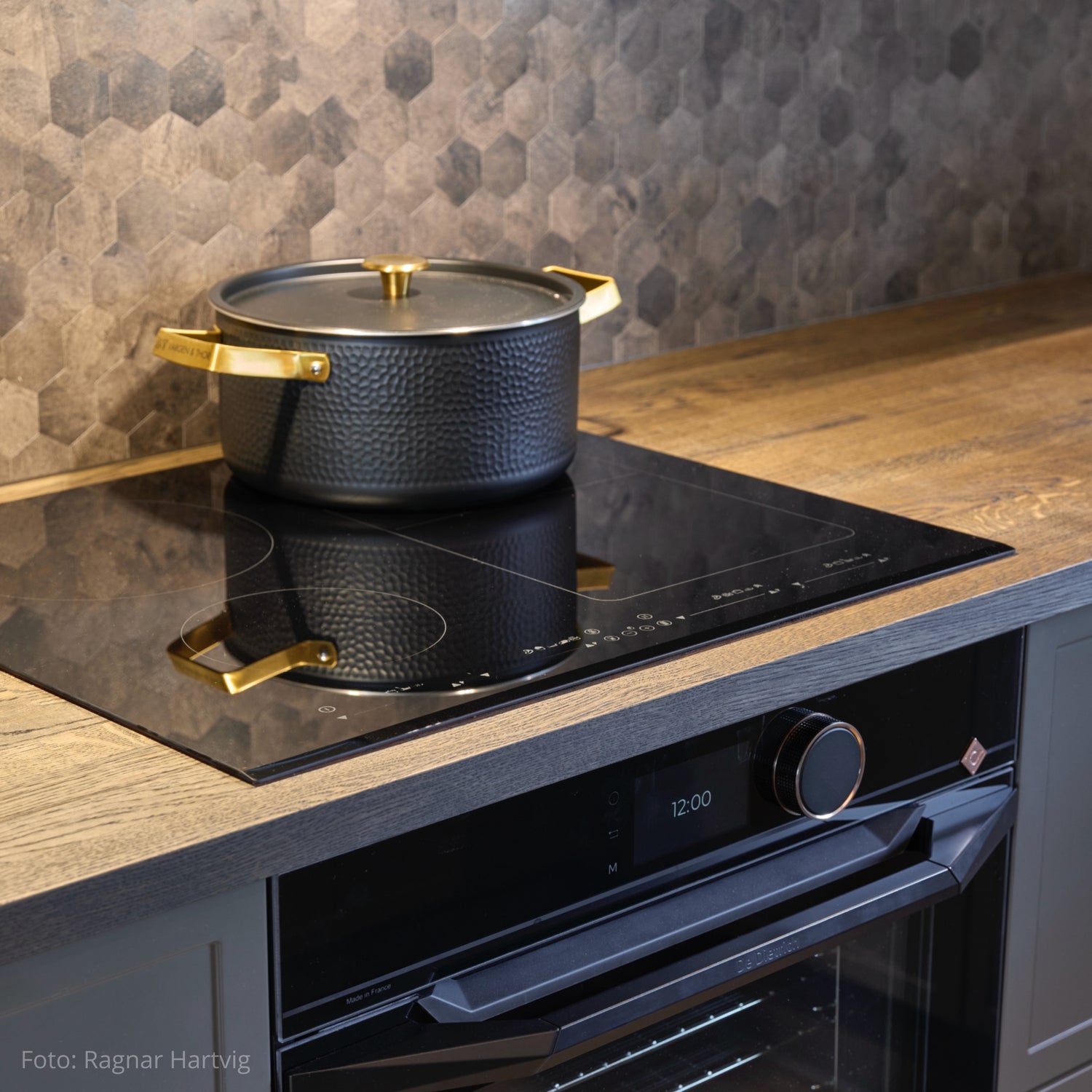 Den mørkegrå tonen gir dybde til rommet og skaper en tydelig kontrast mot lyse kjøkkenfronter, treverk eller metall. De sekskantede flisene ligger tett sammen og danner et helhetlig mønster uten inntrykk av fug.