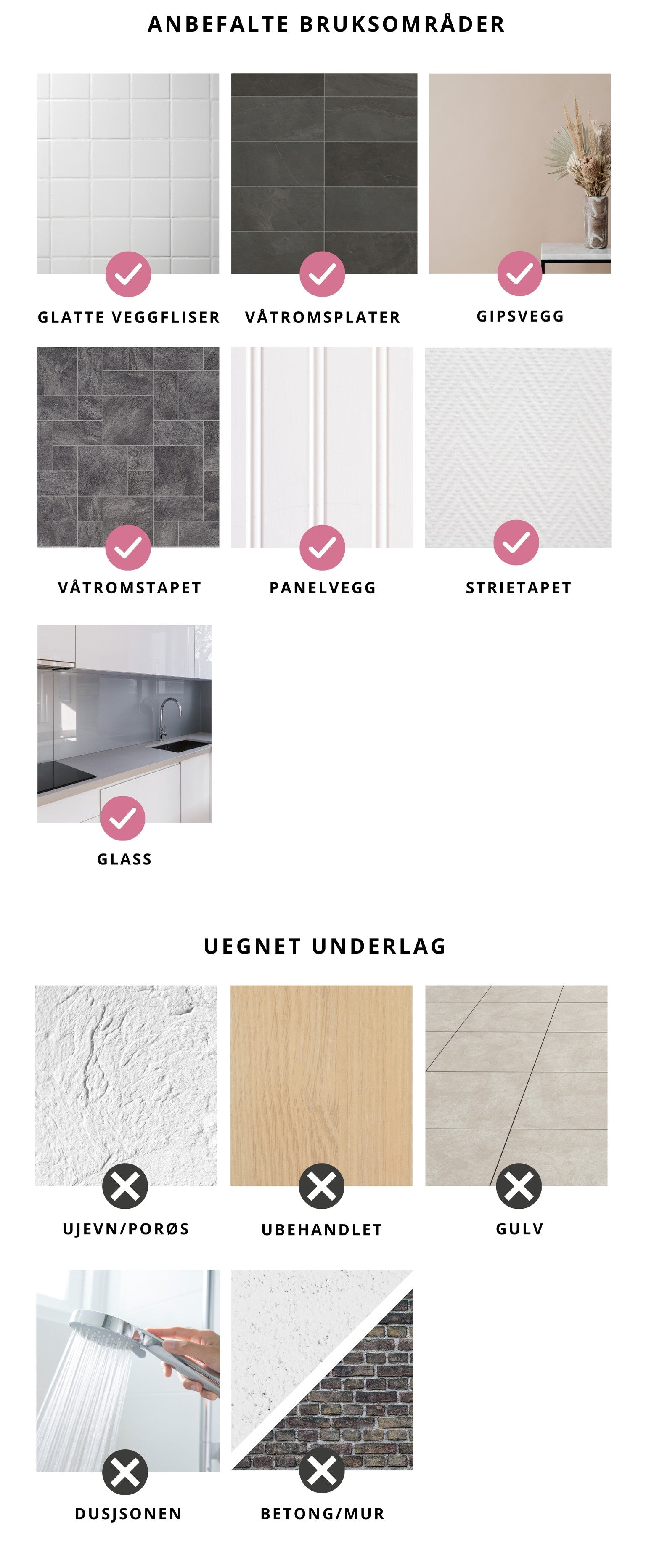 Flisene har selvklebende bakside som gjør monteringen enkel. Du fjerner bare beskyttelsesfilmen og fester flisene direkte på en glatt og ren veggflate. De kan også tilpasses med tapetkniv ved behov. Overflaten tåler daglig bruk og er enkel å holde ren.