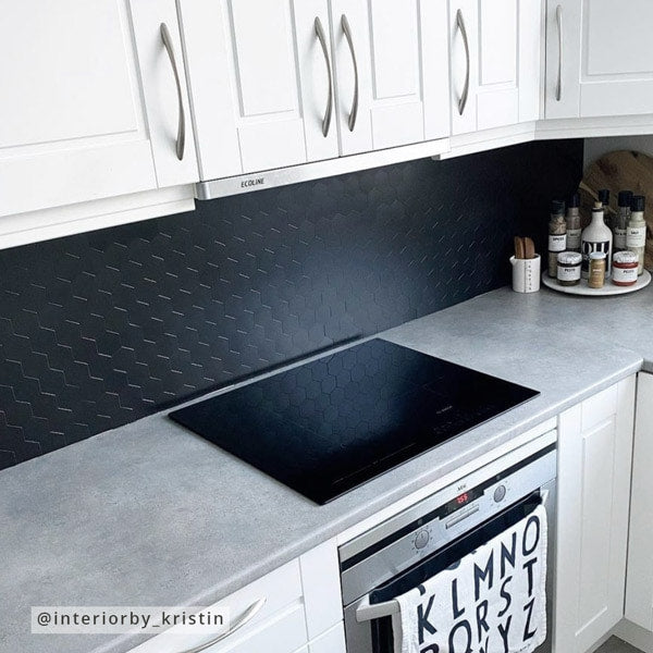 Sorte sekskantede selvklebende fliser på kjøkkenvegg, moderne og stilren backsplash bak vasken.