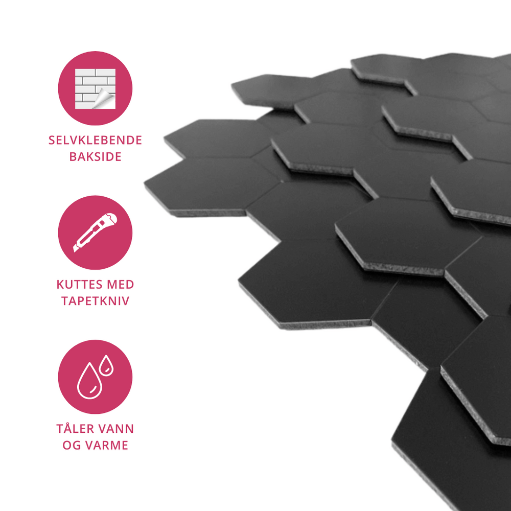 Hexagon sort matt selvklebende veggfliser med nydelig matt finish.
