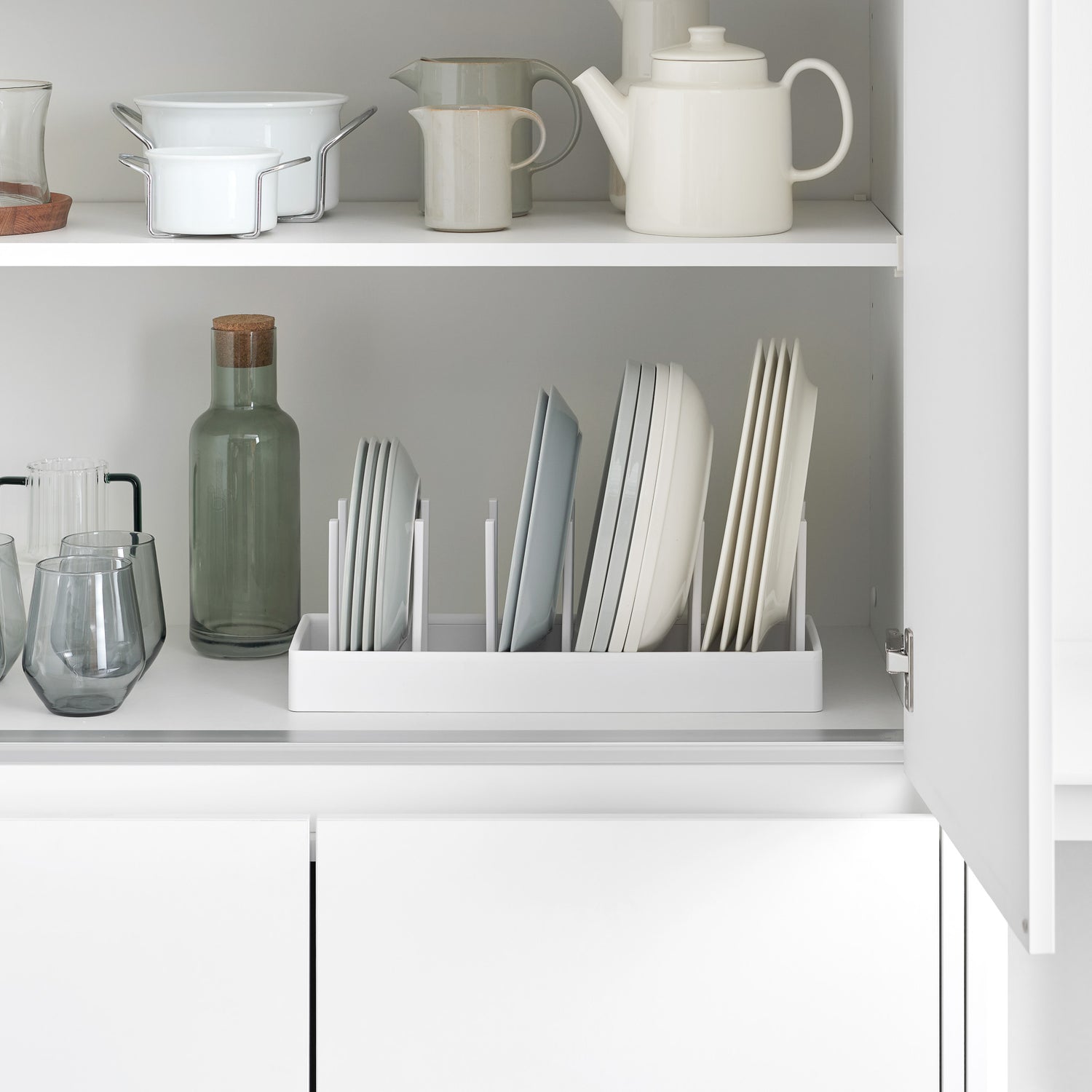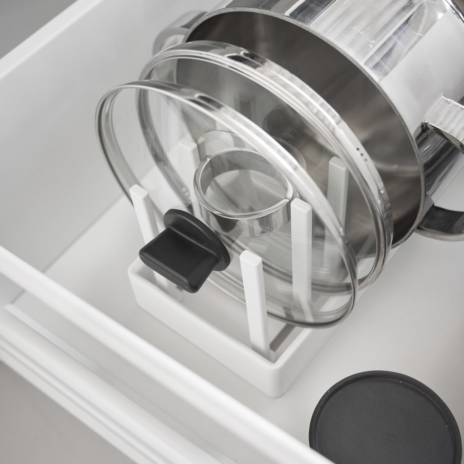 Hvit justerbar gryte- og lokkholder med skillevegger i kjøkkenskuff.