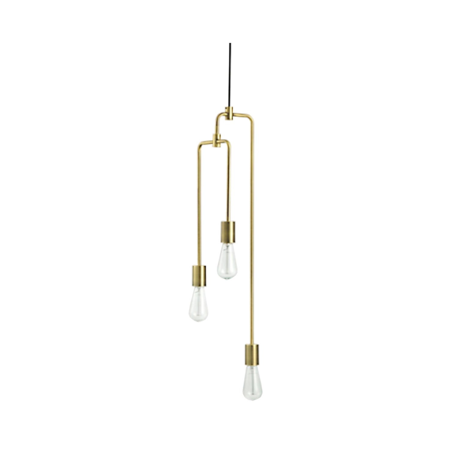 Moderne taklampe i gullfarget metall med tre armer som henger i ulike høyder. Designet gir et balansert og dekorativt uttrykk med god lysspredning.