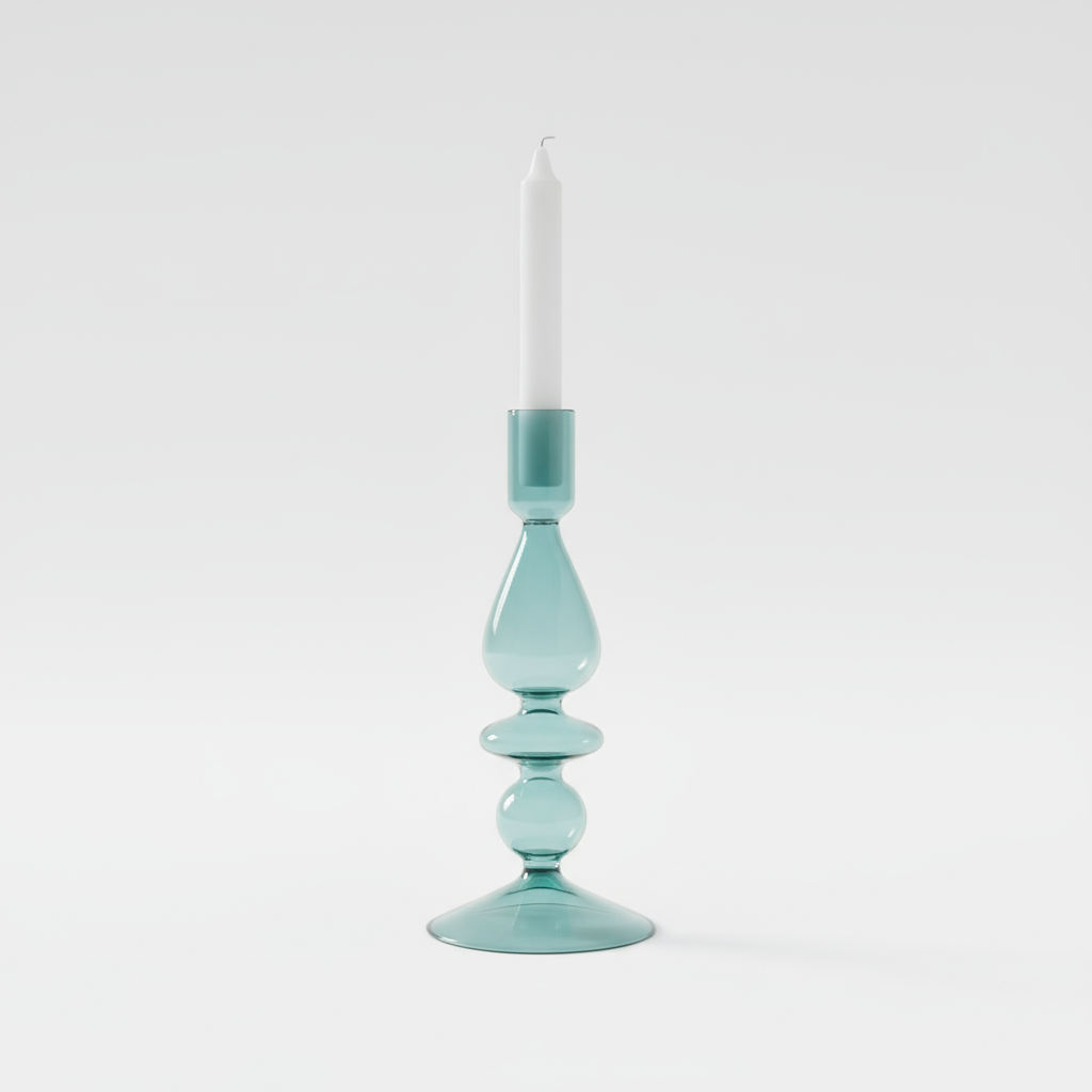 Denne lysestaken i blått glass gir et vakkert og rolig uttrykk når du tenner lys. Formen kombinerer moderne design med klassisk glans, og det transparente glasset reflekterer lyset på en fin måte.