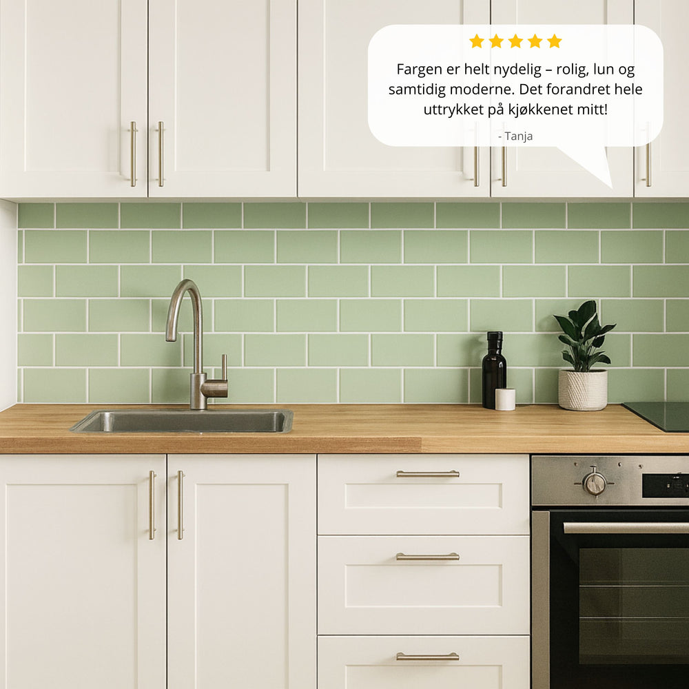 Gi kjøkkenet eller badet en moderne oppgradering med Subway selvklebende fliser i sage green. Disse flisene etterligner klassiske subway-fliser og kommer i en lys grønn nyanse med hvite fuger som skaper et friskt uttrykk. Den glansede finishen gir rommet en luksuriøs følelse. Perfekt for deg som ønsker en rask, rimelig og enkel oppussing uten håndverker.