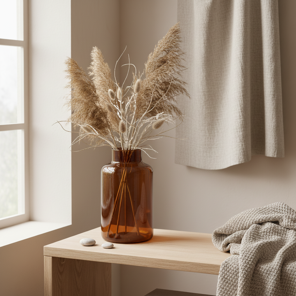 Amberfarget dekorvase i resirkulert glass med pampasgress, plassert i vinduskarm – varm og moderne interiørstil fra Lindas Dekor.
