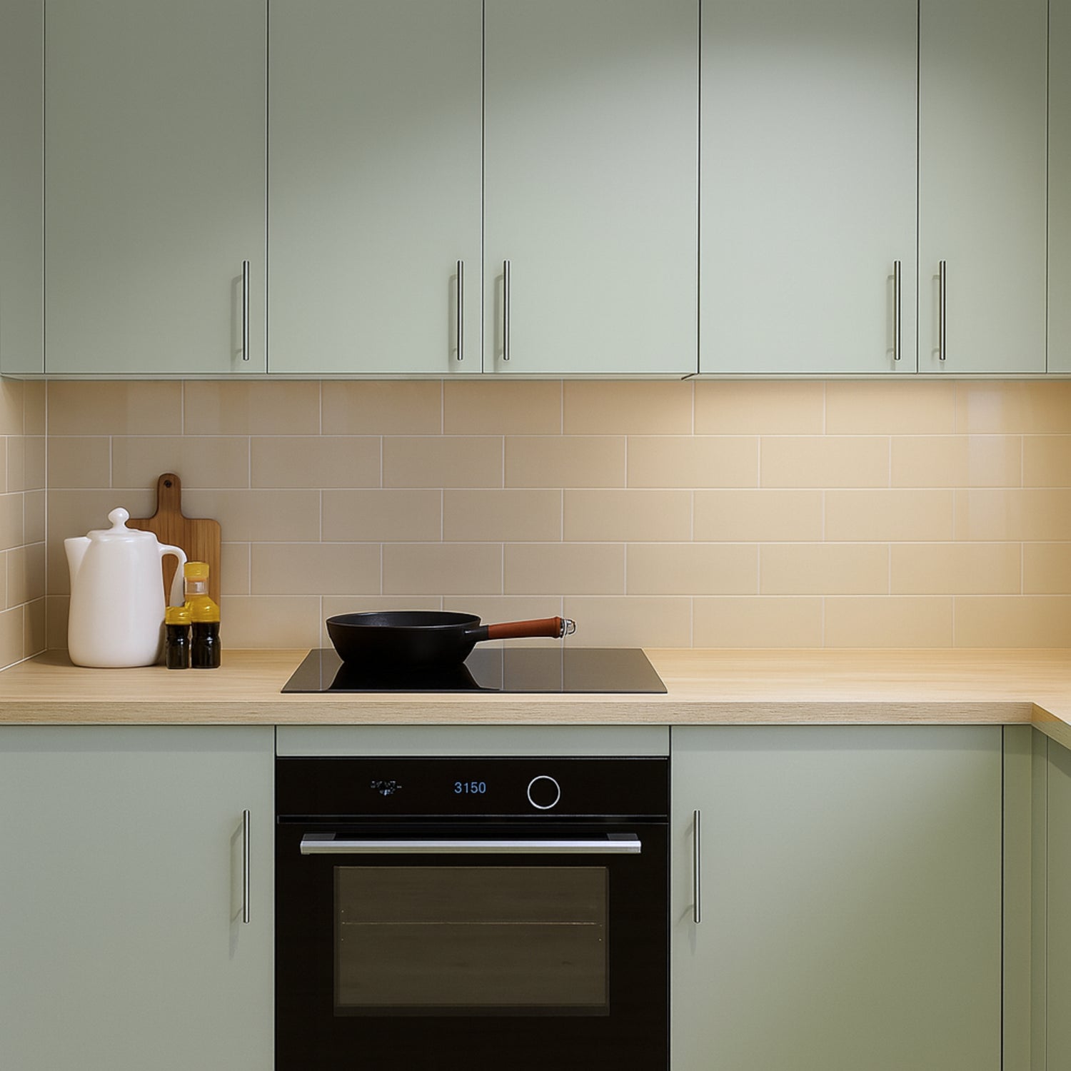 Ved å kombinere grønne toner, lyse benkeplater og varme beige fliser fikk rommet et mykt og innbydende uttrykk som passer perfekt til både hytte og hjem.
