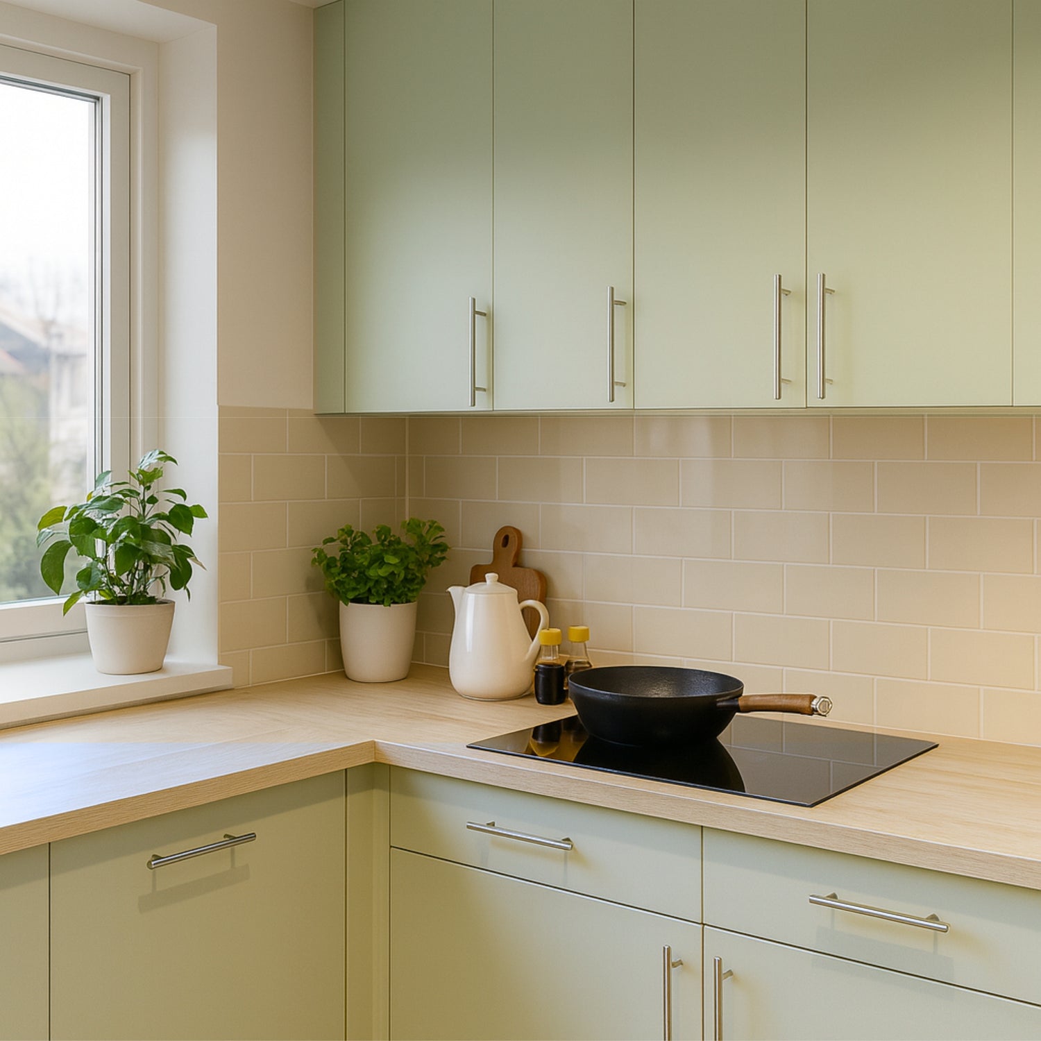 Kjøkkenvindu i Sykepleierhytten omgitt av grønne skapfronter, beige selvklebende fliser og lyse benkeplater – som sett i Eventyrlig Oppussing med produkter fra Lindas Dekor.