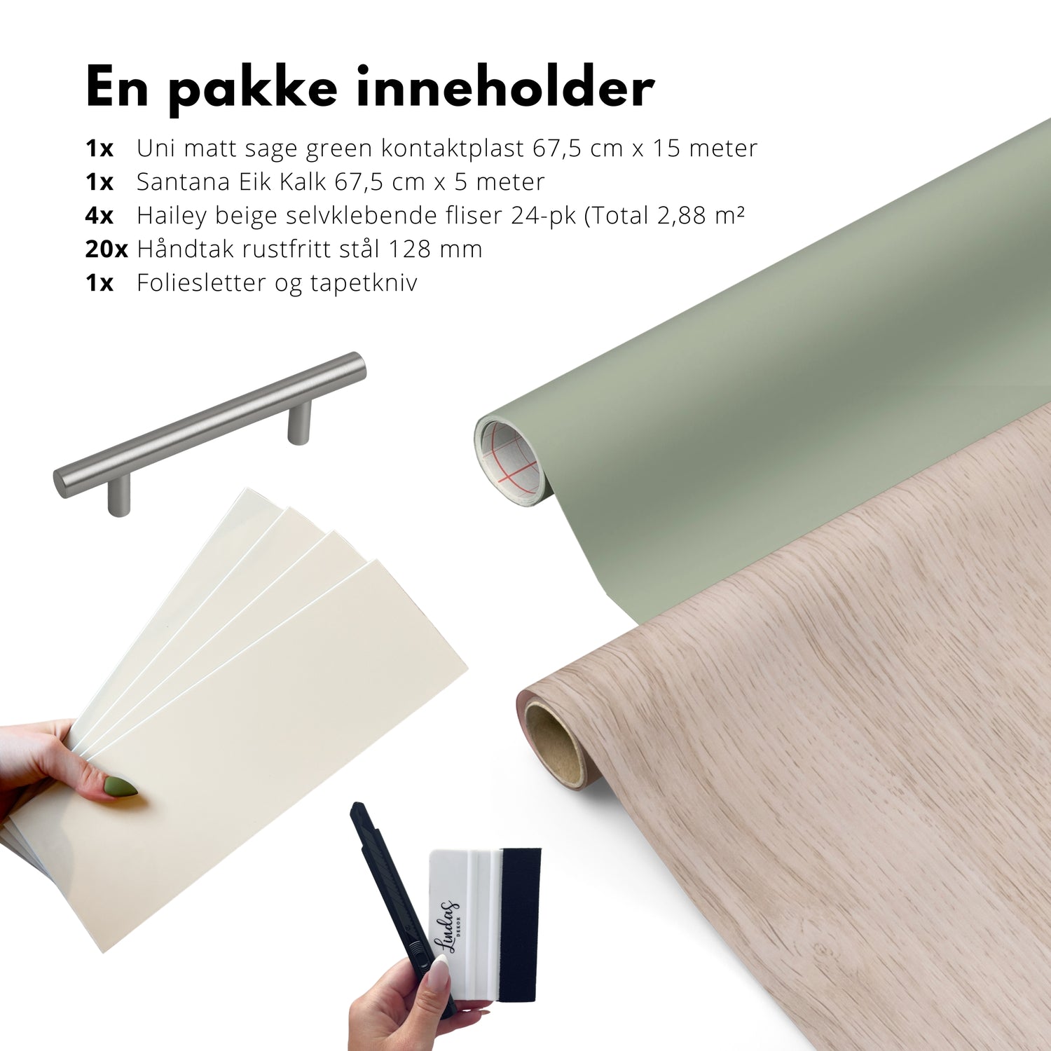 DIY komplett kjøkkenpakke med selvklebende fliser, folie til slette skapdører, folie til benkeplate og håndtak