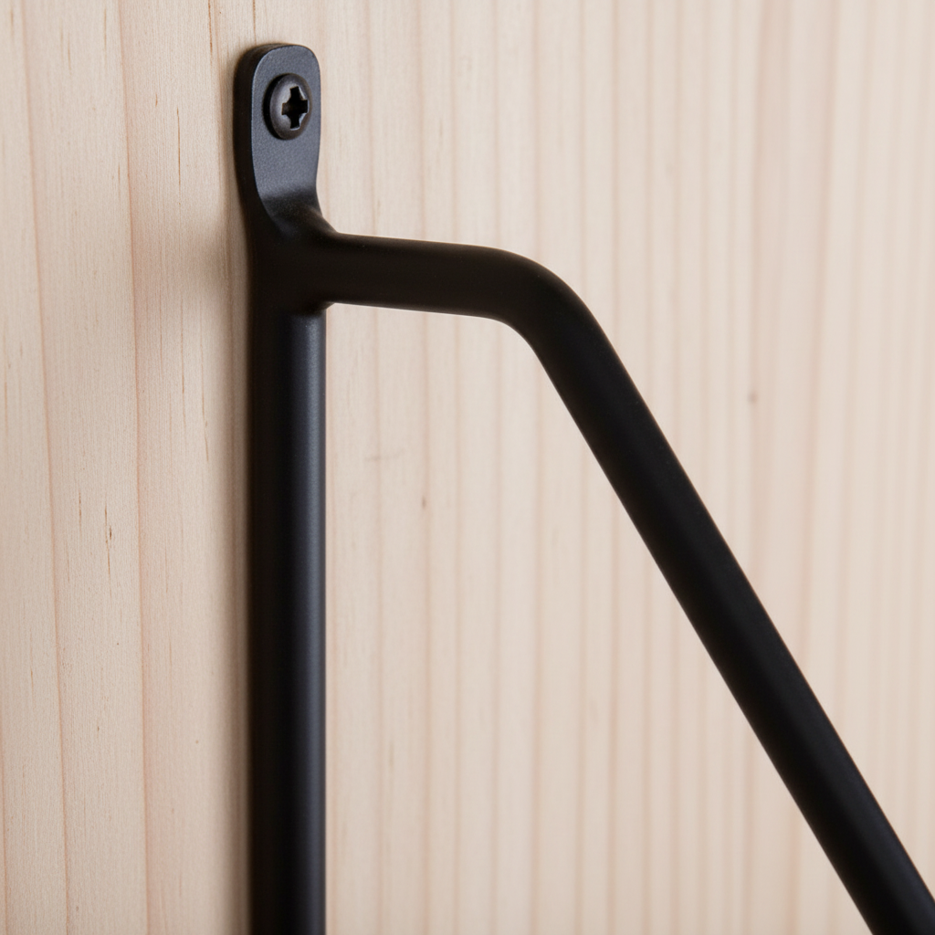 Arnhem vegghylle kombinerer en ren treflate med en markert sort ramme som gir veggen et strammere og mer definert uttrykk. Designet skaper en tydelig kontrast mellom varme og mørke elementer, noe som gir rommet mer karakter.